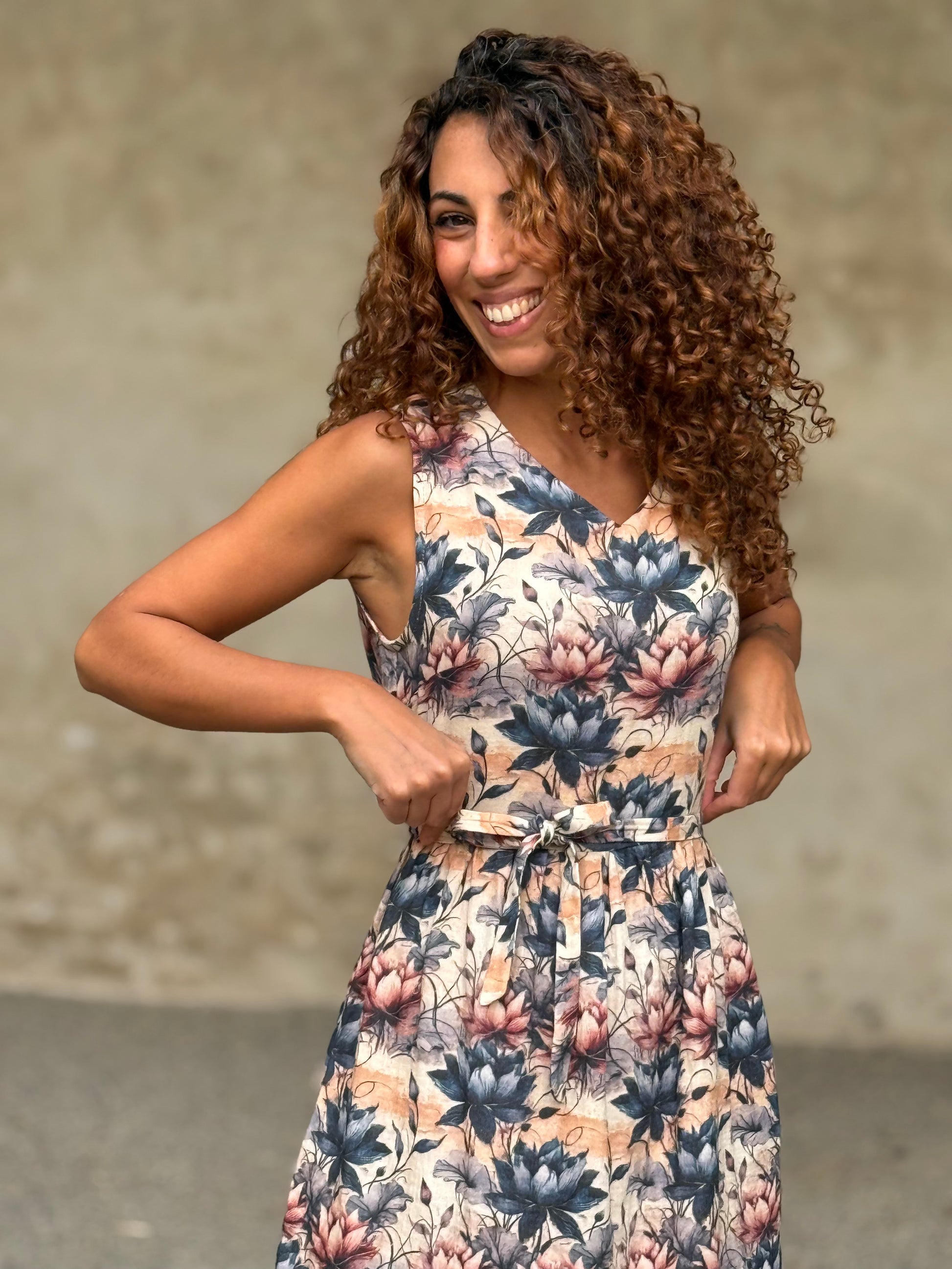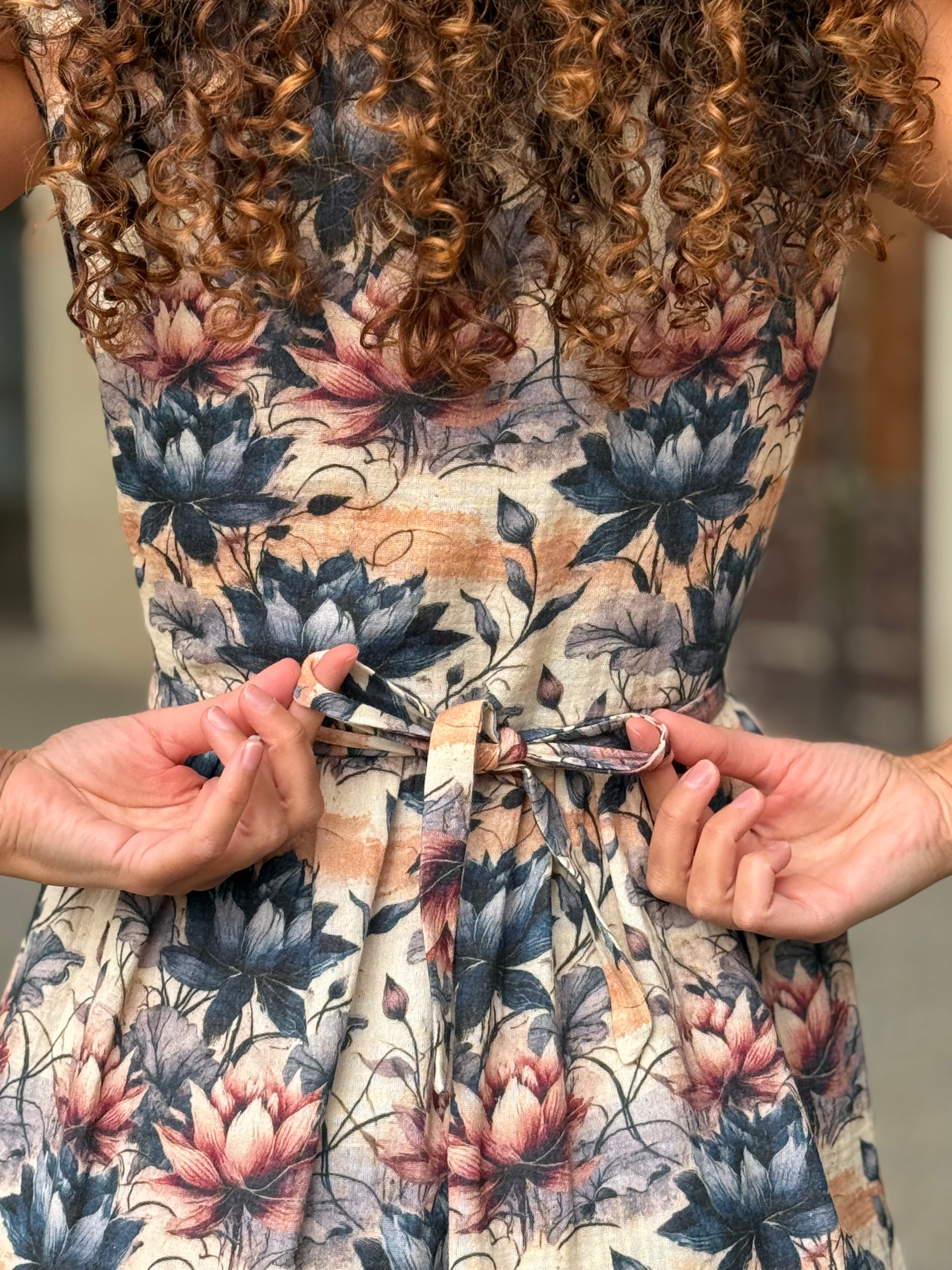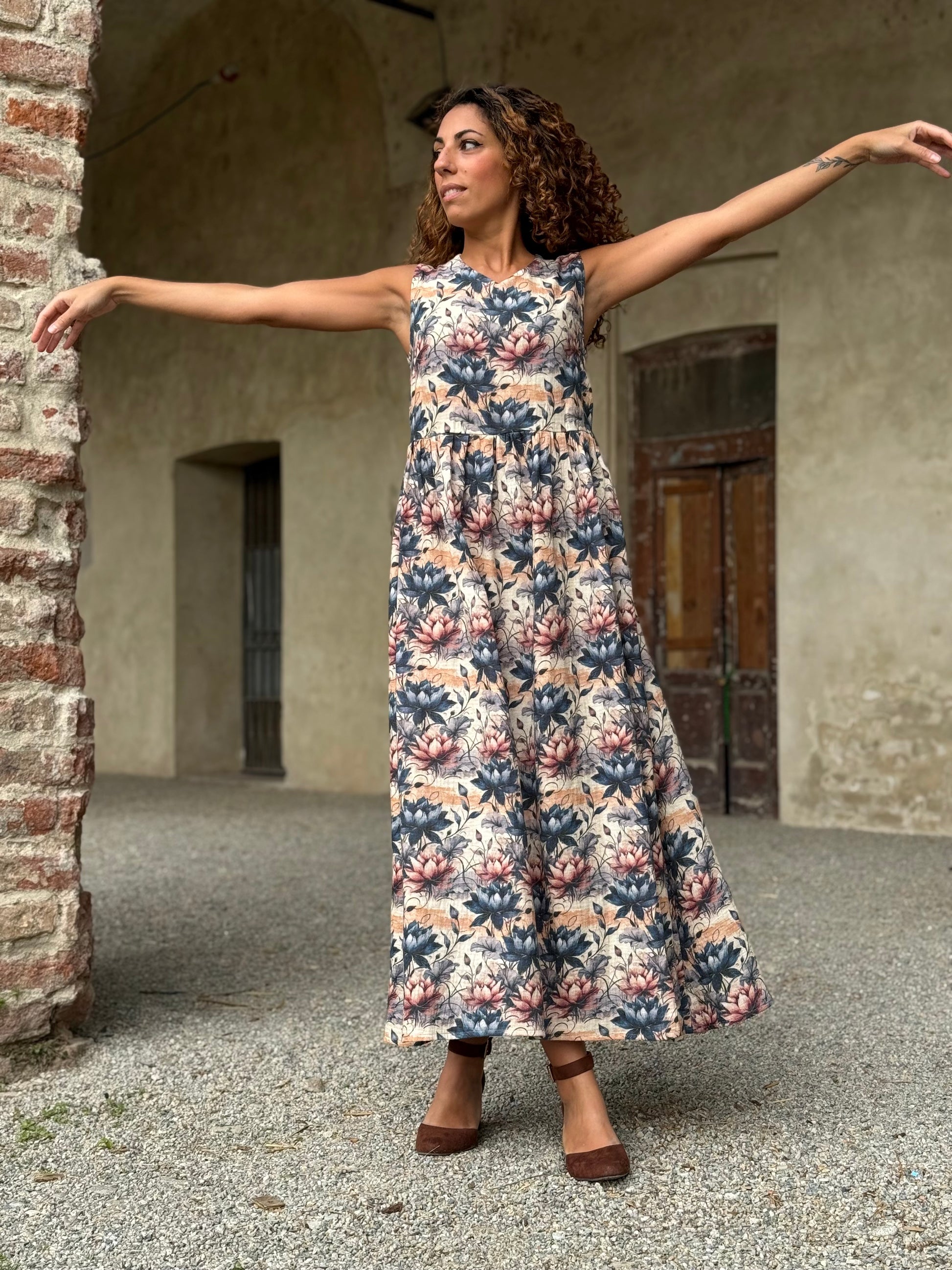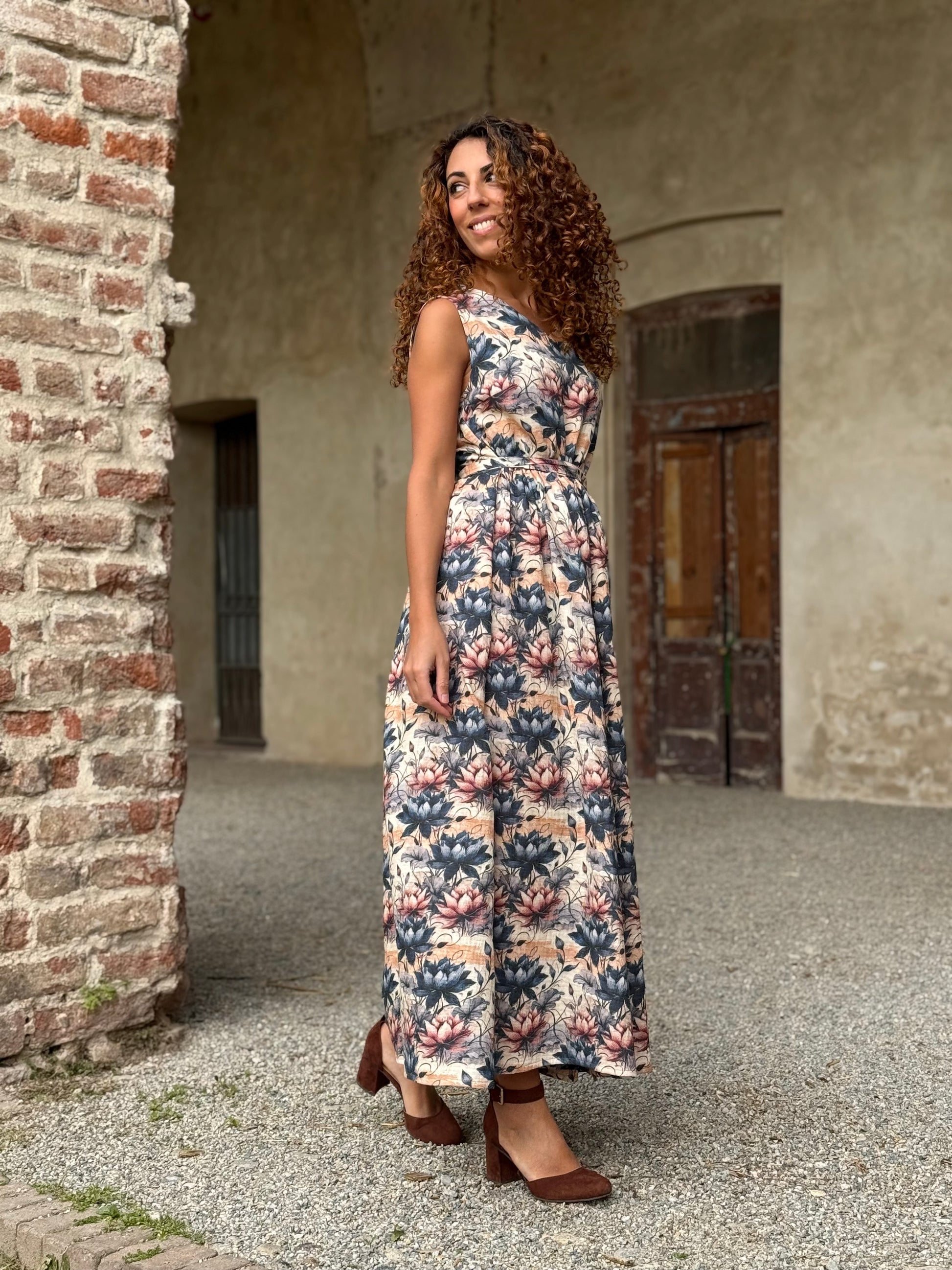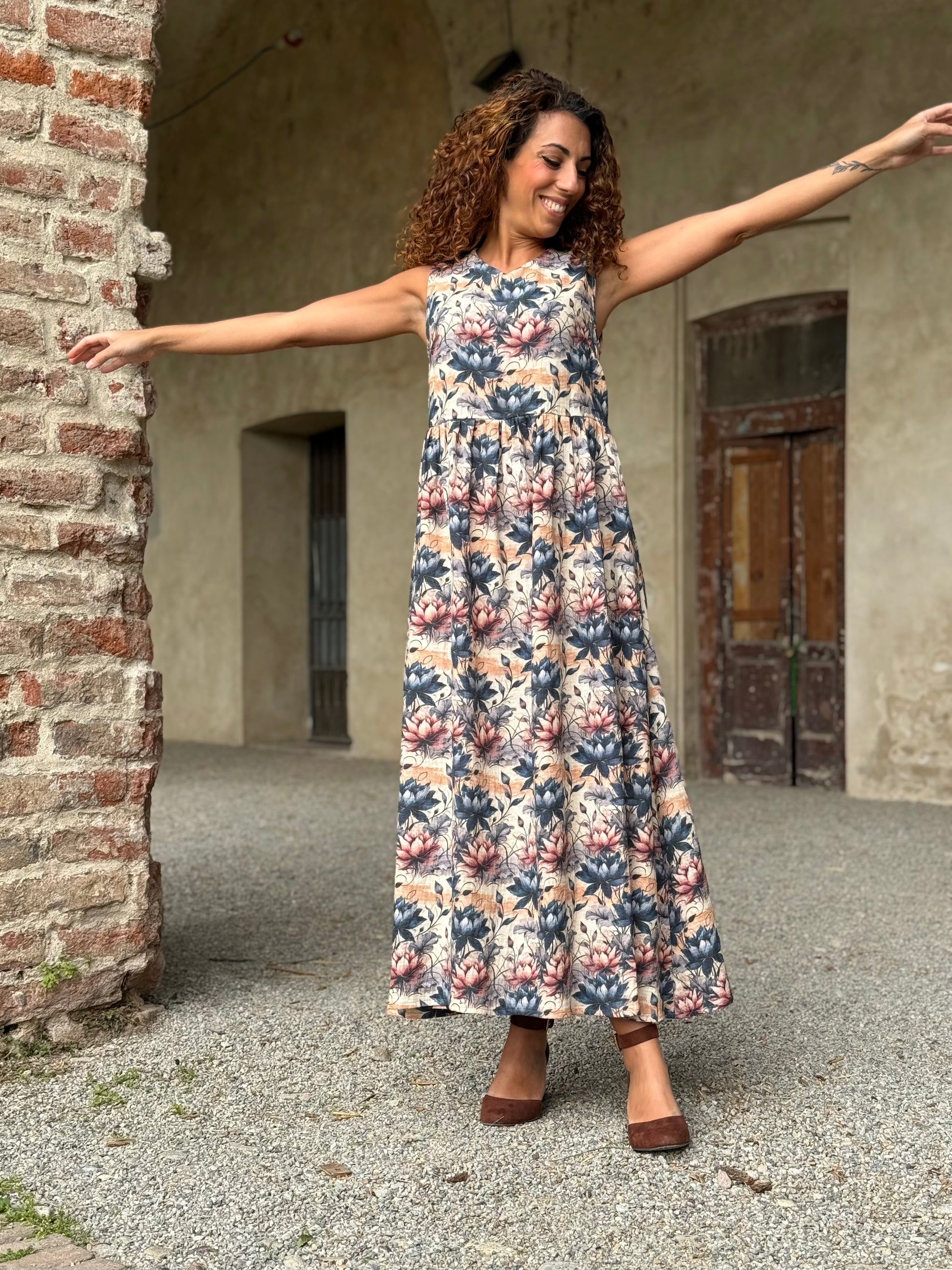 Nuvola è quell’abito che ti trasporta in una favola, delinea la figura con comodità e respiro lasciando decidere a te la vestibilità di cui hai bisogno grazie alla cinturina da annodare come preferisci.