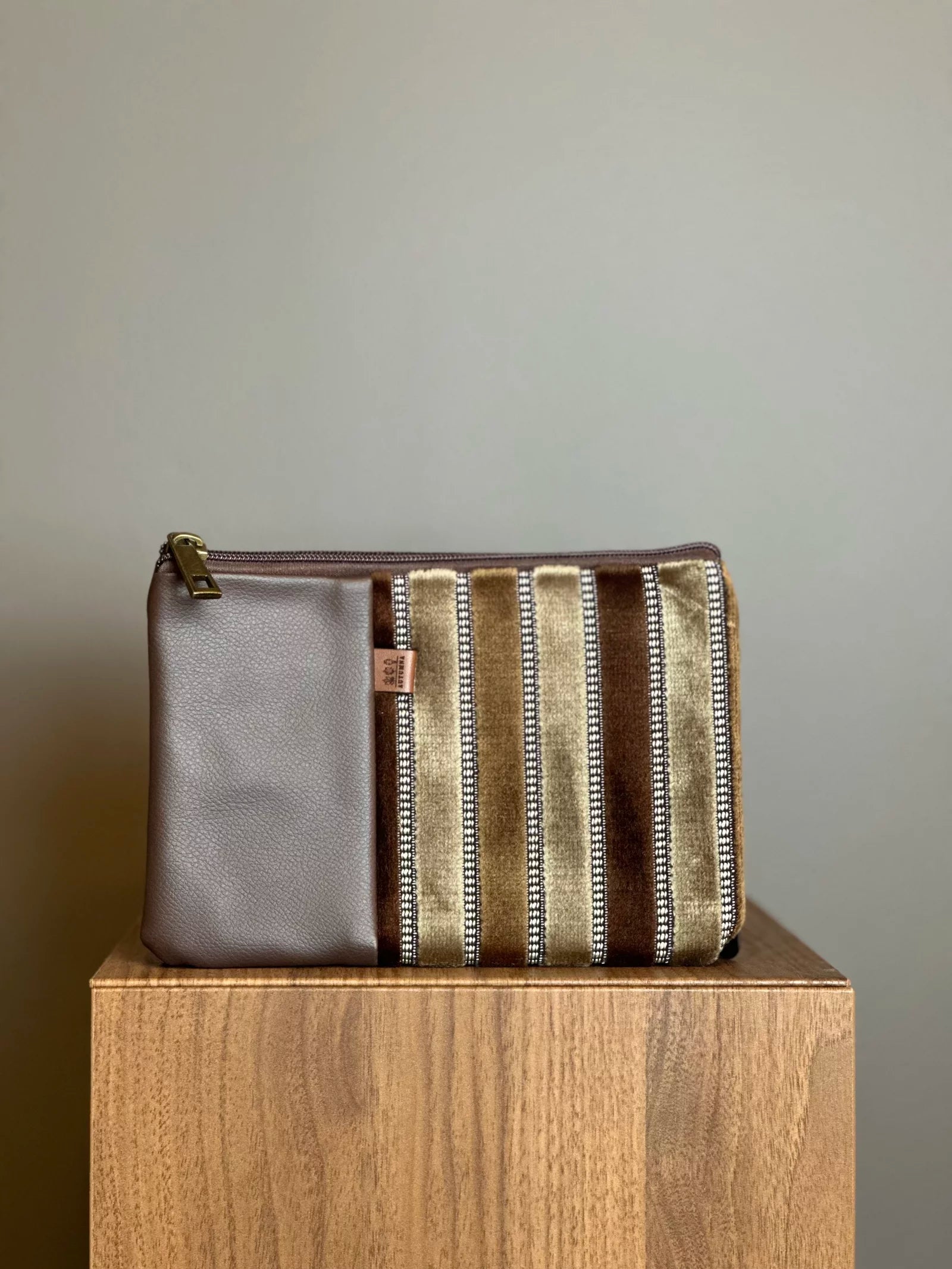 Realizzata a mano in similpelle e tessuto d'arredo.