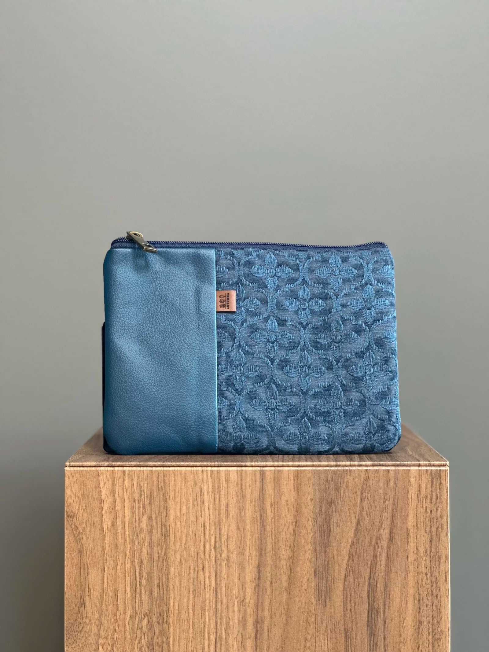 Realizzata a mano in similpelle e tessuto d'arredo.