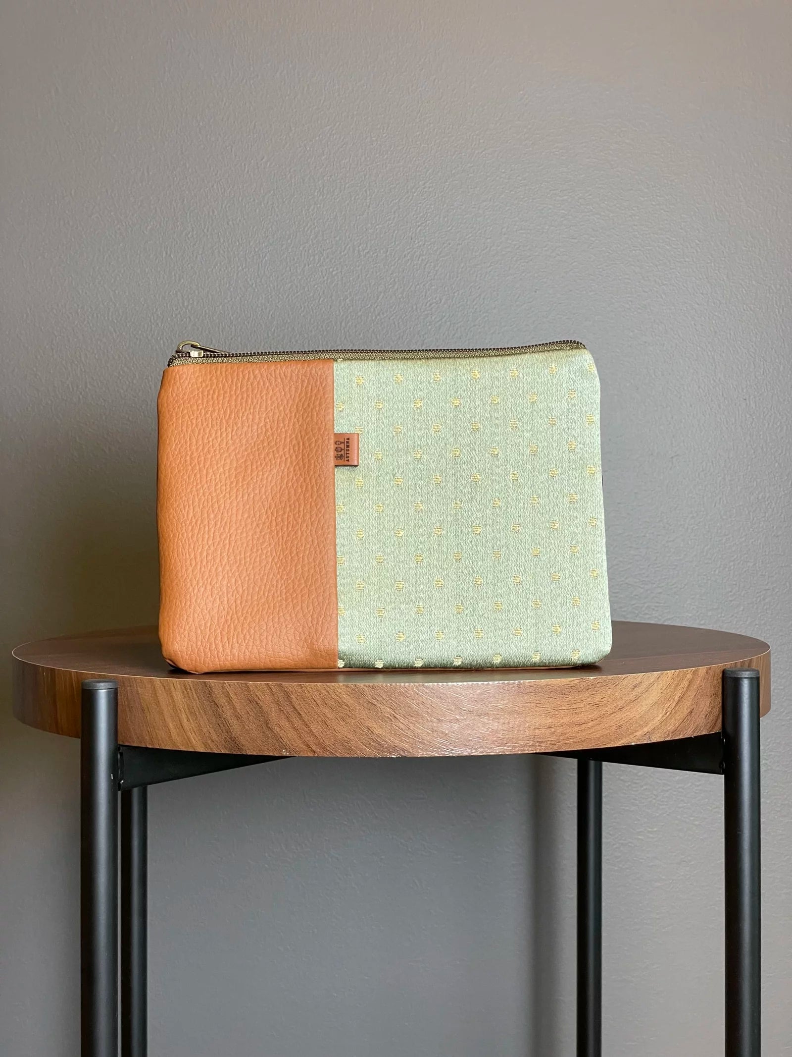 Realizzata a mano in similpelle e tessuto d'arredo.