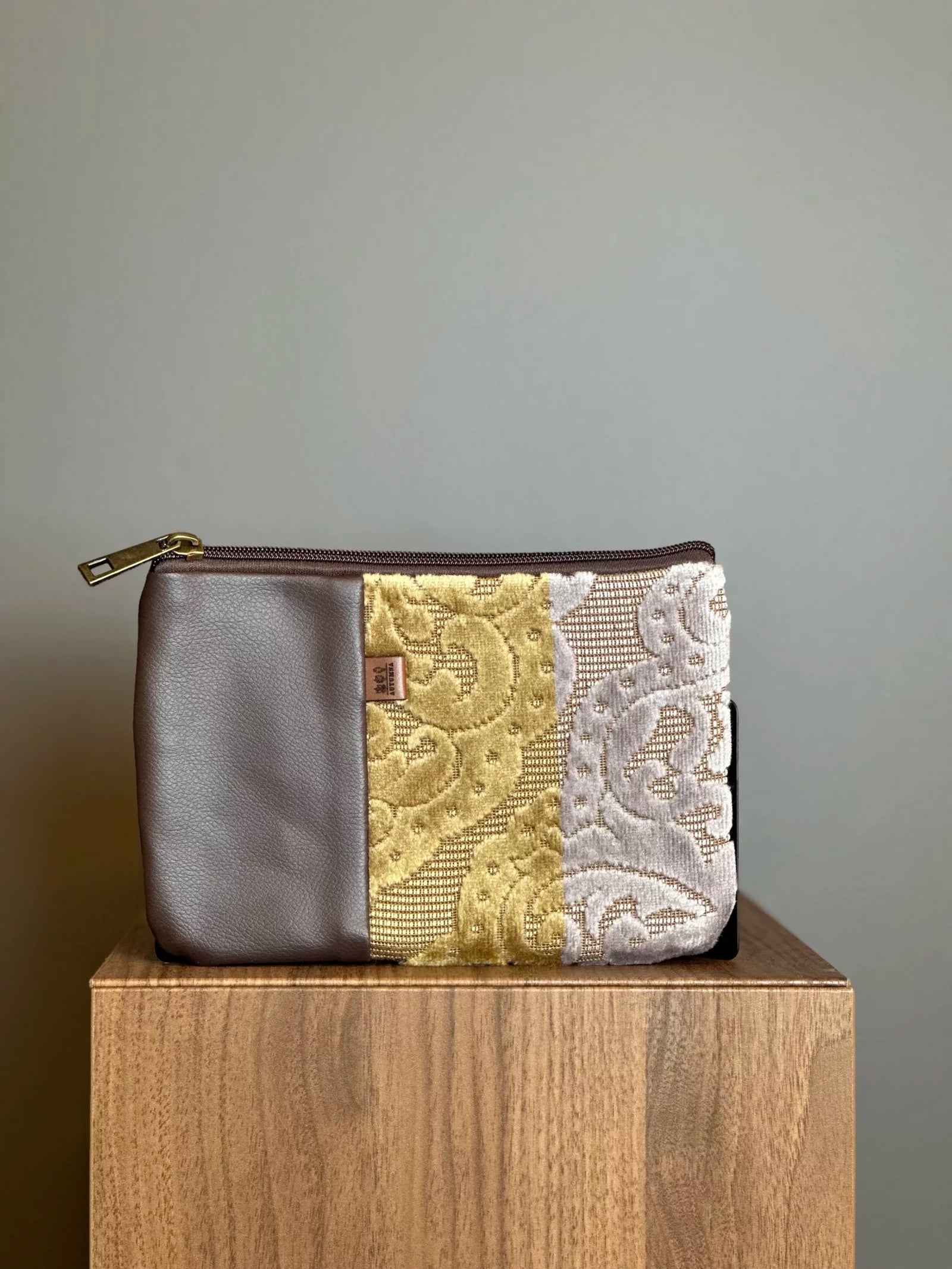 Realizzata a mano in similpelle e tessuto d'arredo.