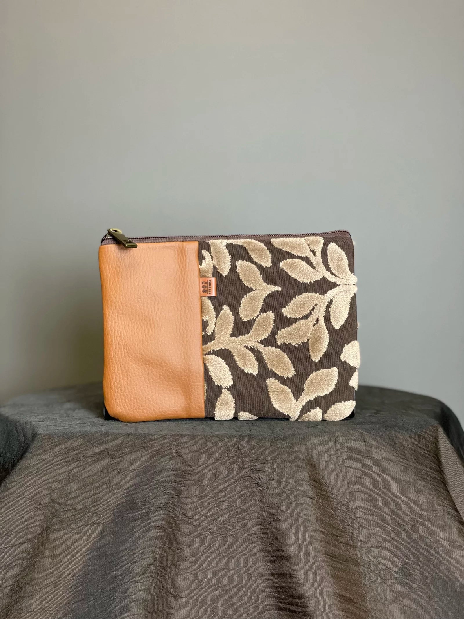 Realizzata a mano in similpelle e tessuto d'arredo.