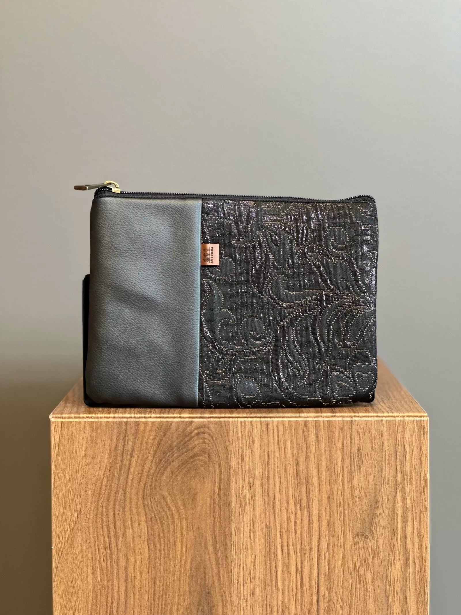 Realizzata a mano in similpelle e tessuto d'arredo.