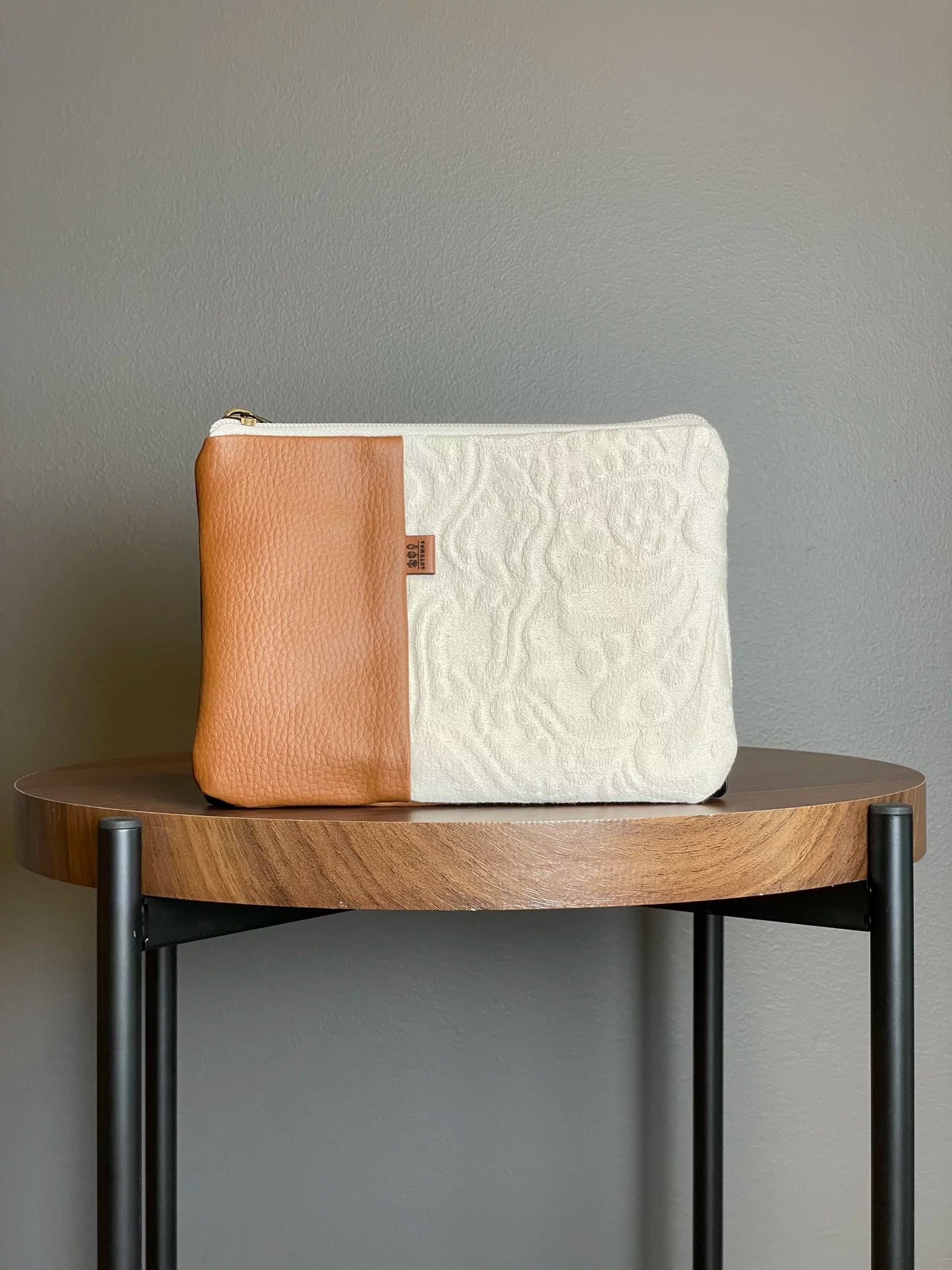 Realizzata a mano in similpelle e tessuto d'arredo.