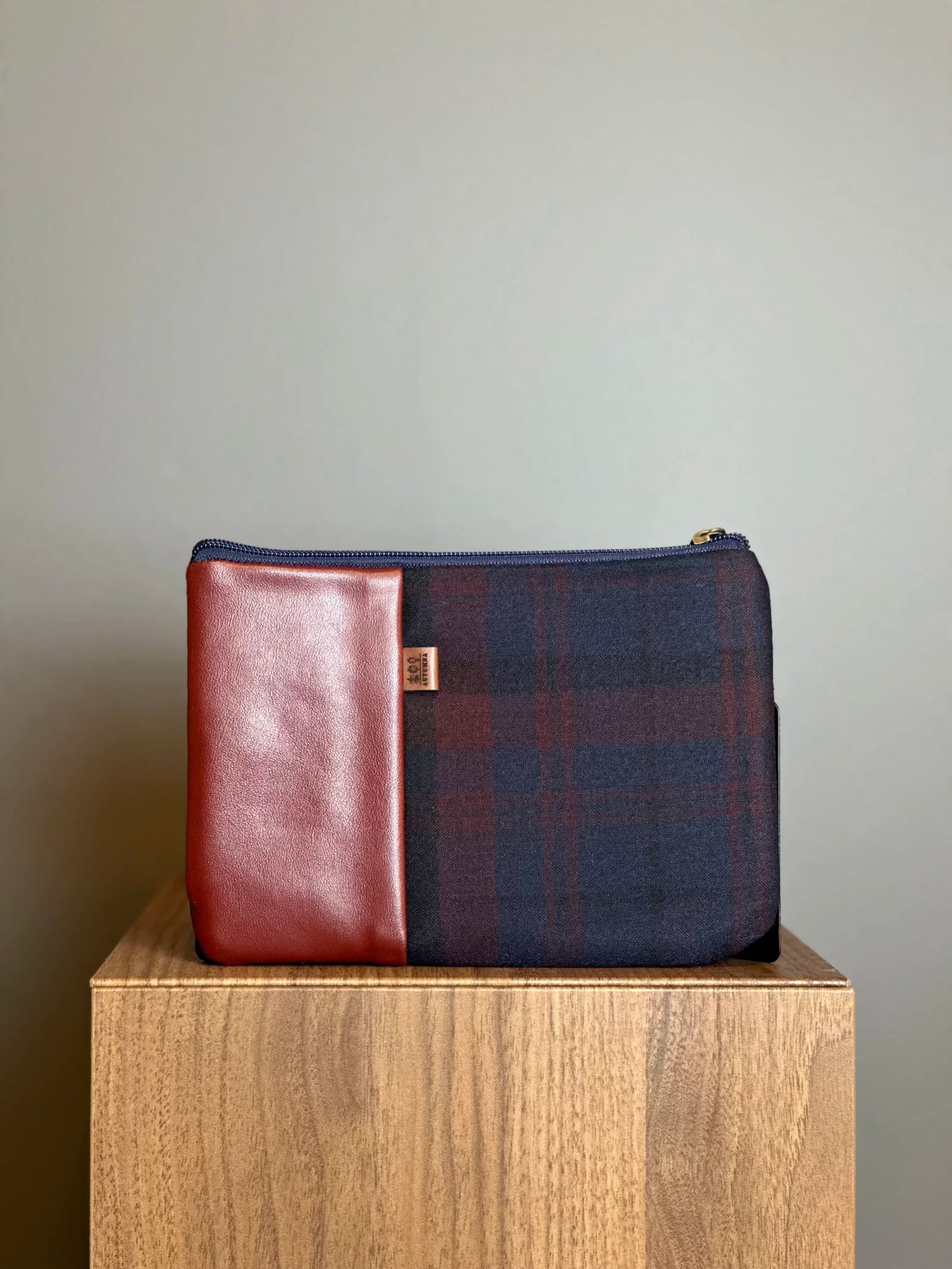 Realizzata a mano in similpelle e tessuto d'arredo.