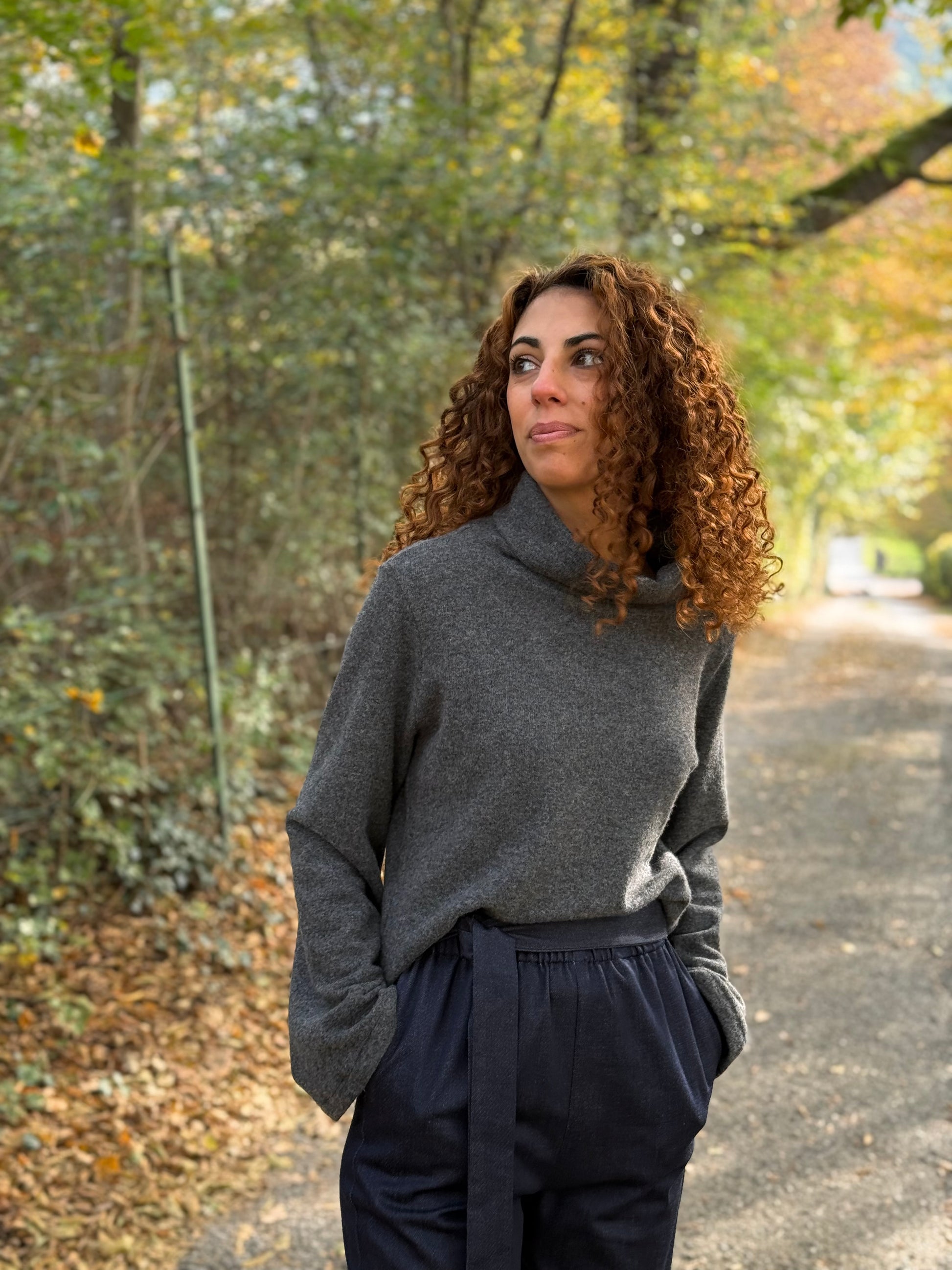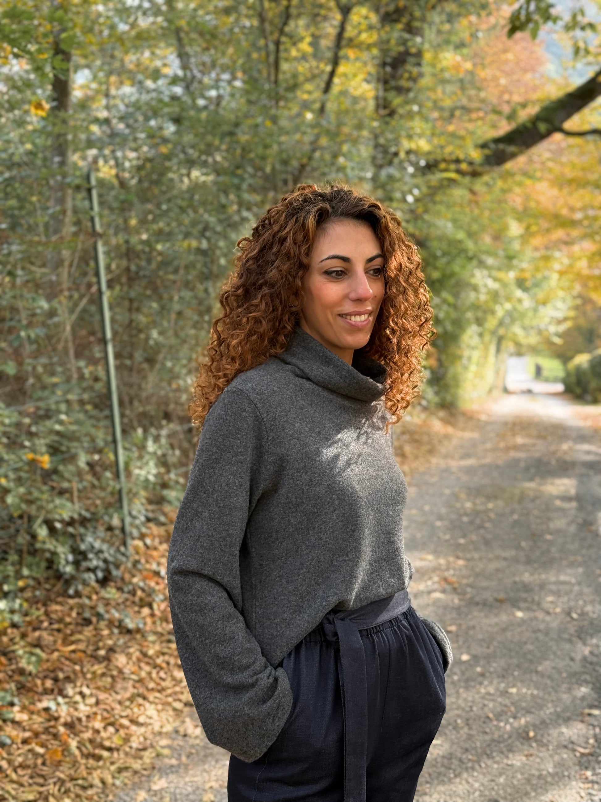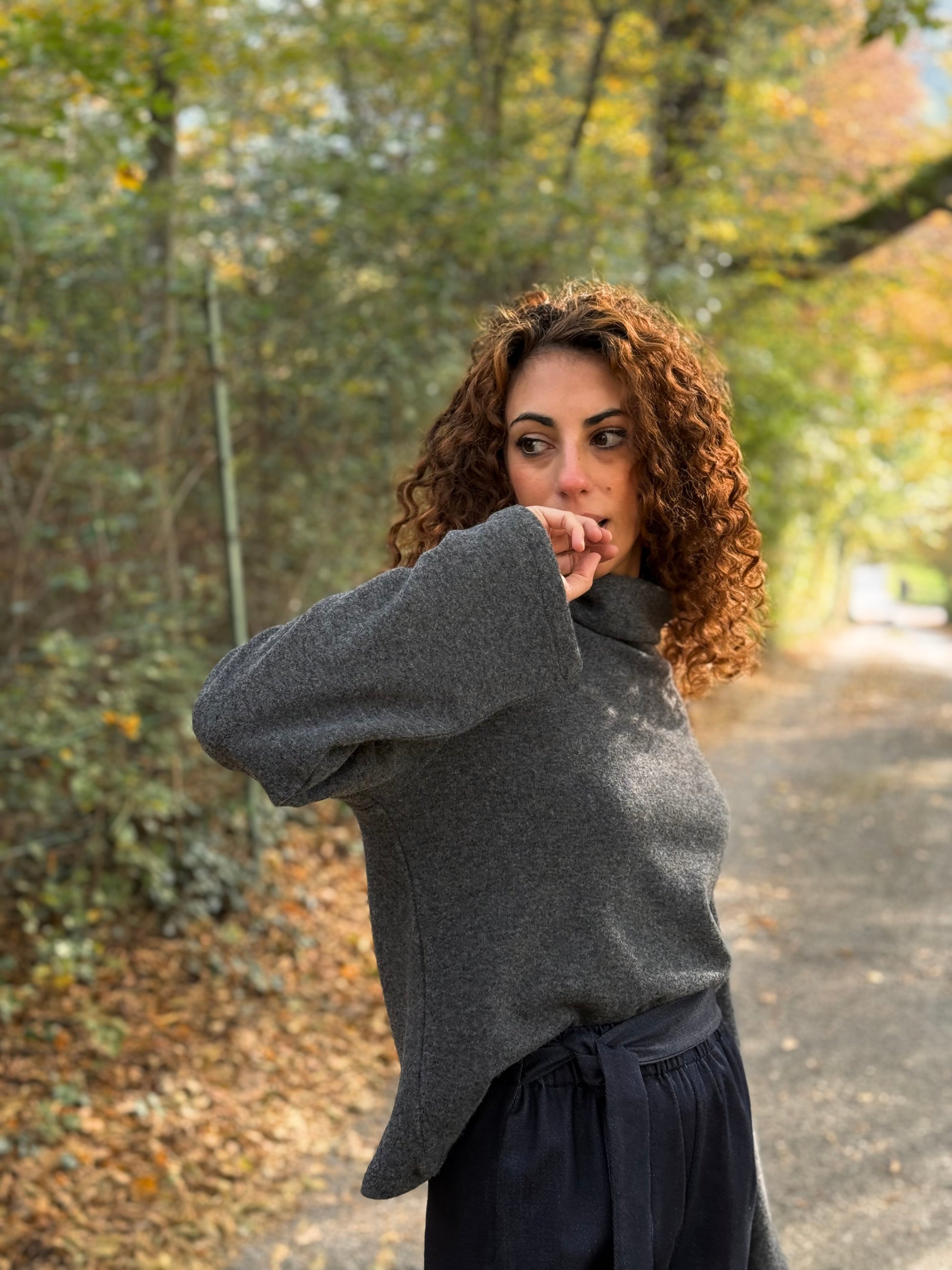 Come un morbido abbraccio, questo maglione avvolge il corpo con una vestibilità ampia e rilassata, caldo e leggero come una carezza.