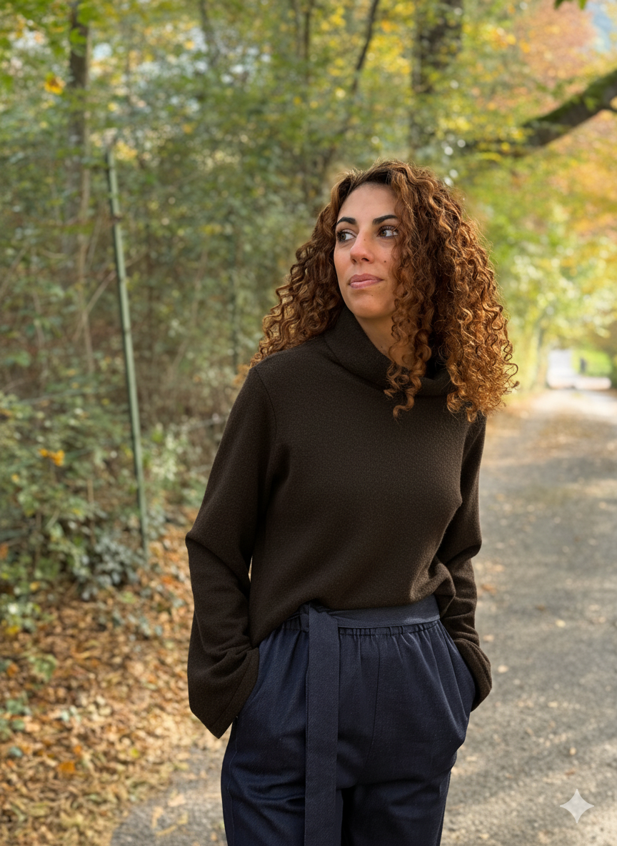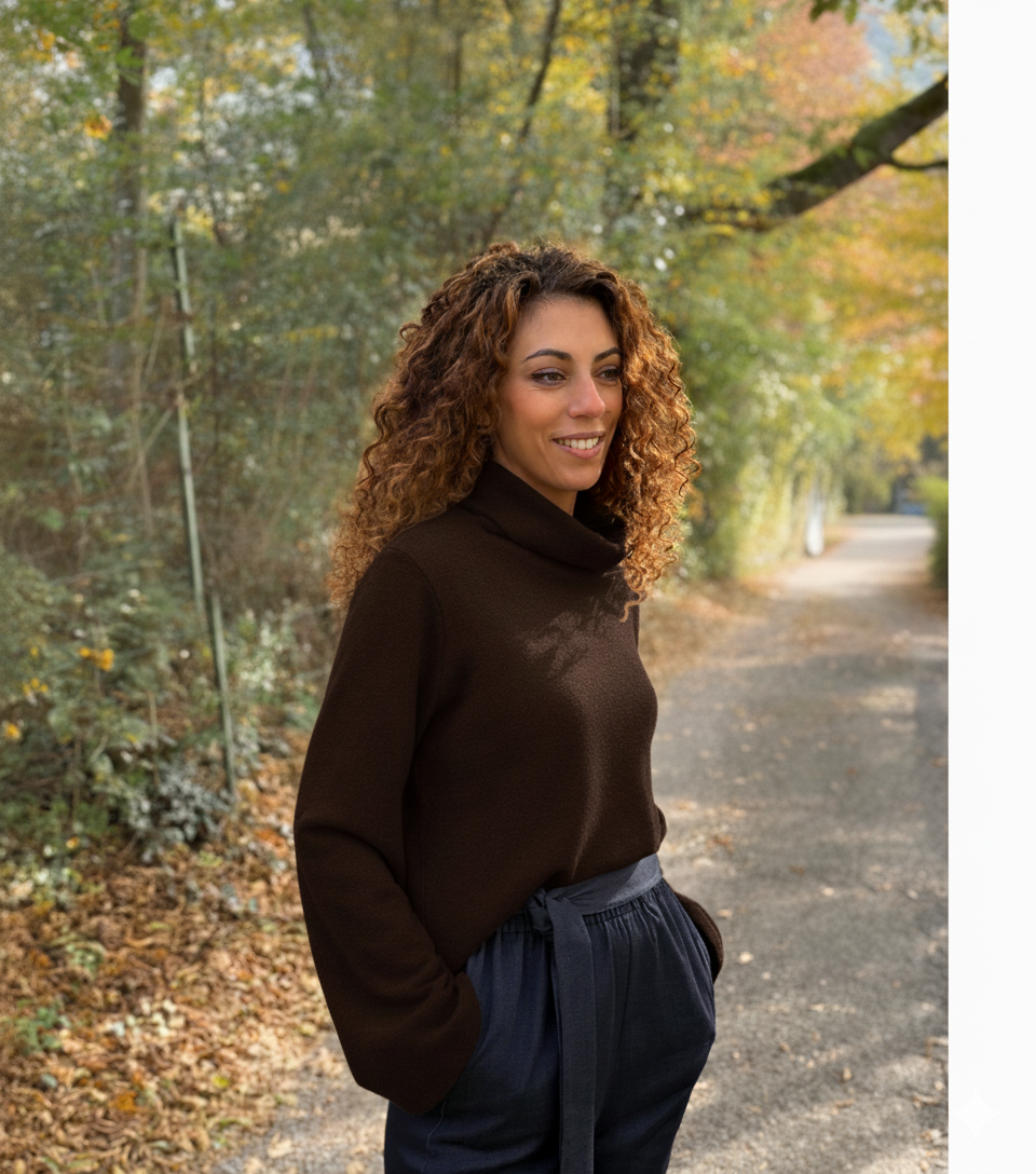 Come un morbido abbraccio, questo maglione avvolge il corpo con una vestibilità ampia e rilassata, caldo e leggero come una carezza.