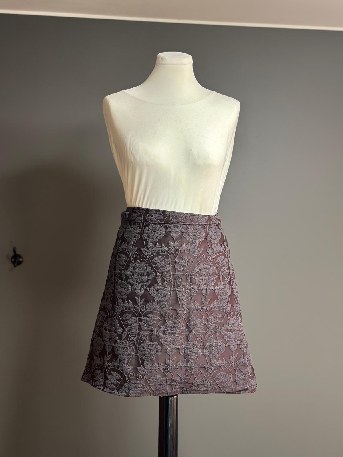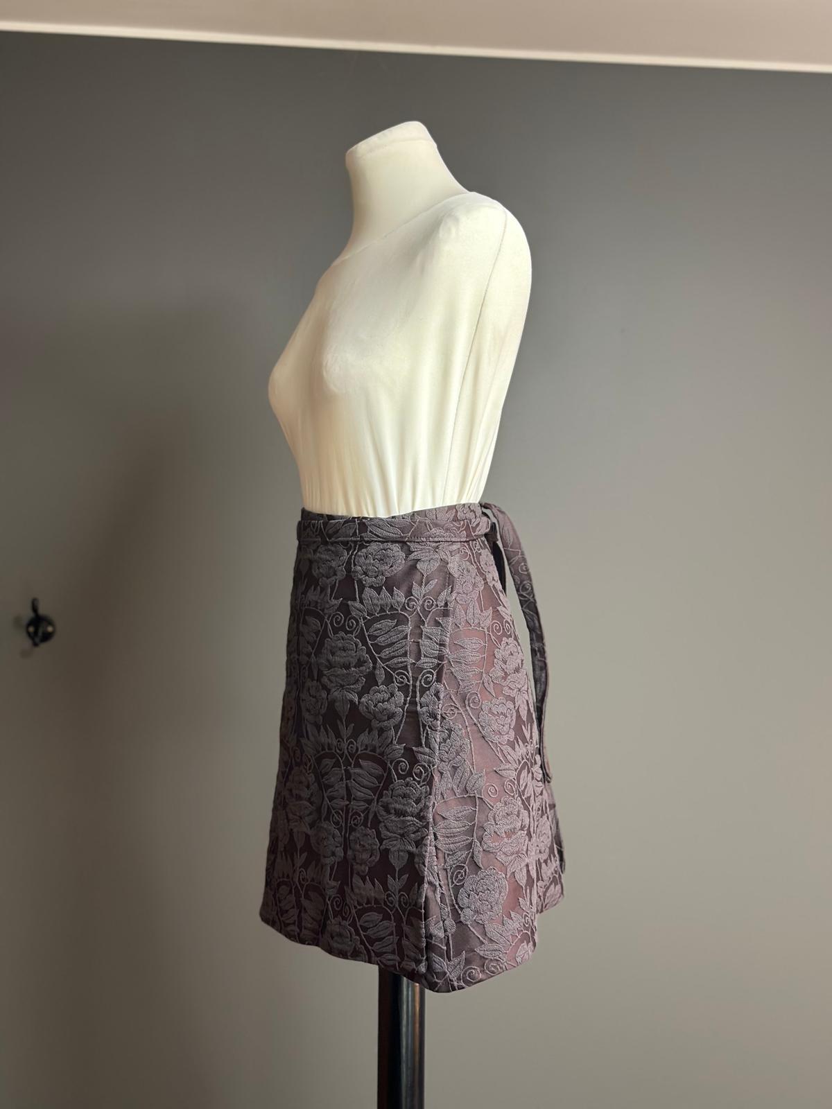 Una gonna a portafoglio dal taglio svasato, senza bottoni né asole, libera da rigidità: si chiude con un semplice nodo, come un abbraccio che si adatta a chi la indossa.