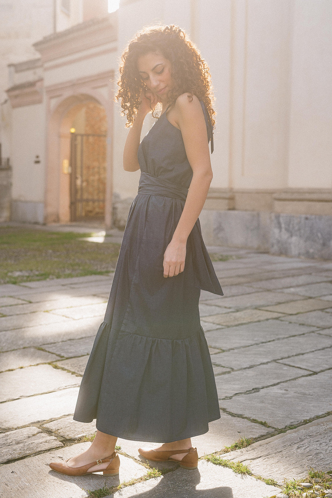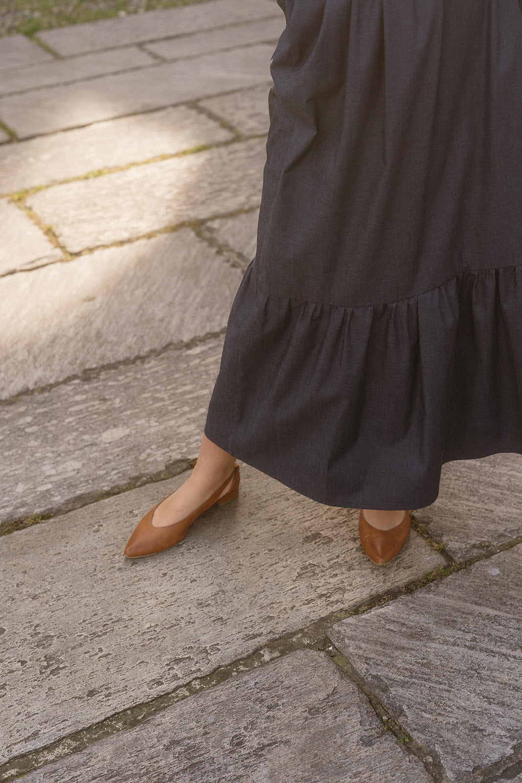 Gonna con balza arricciata, ampia e danzante, si anima a ogni passo e richiama le pieghe di una nuvola che si apre al vento.