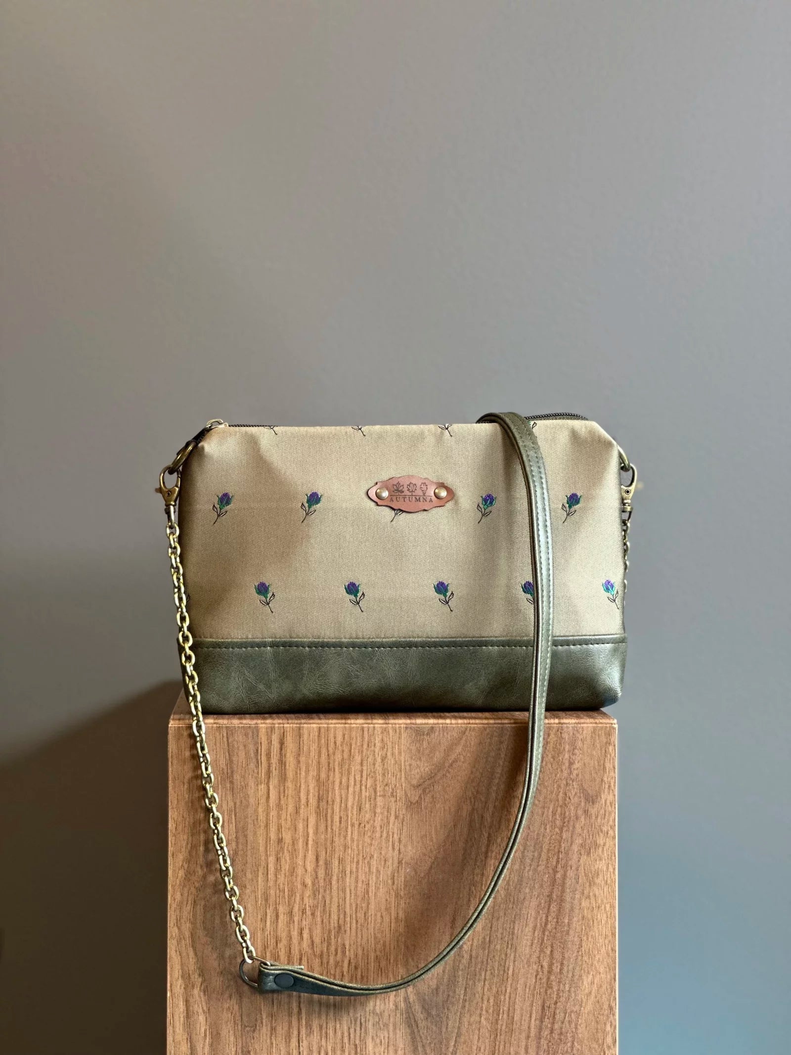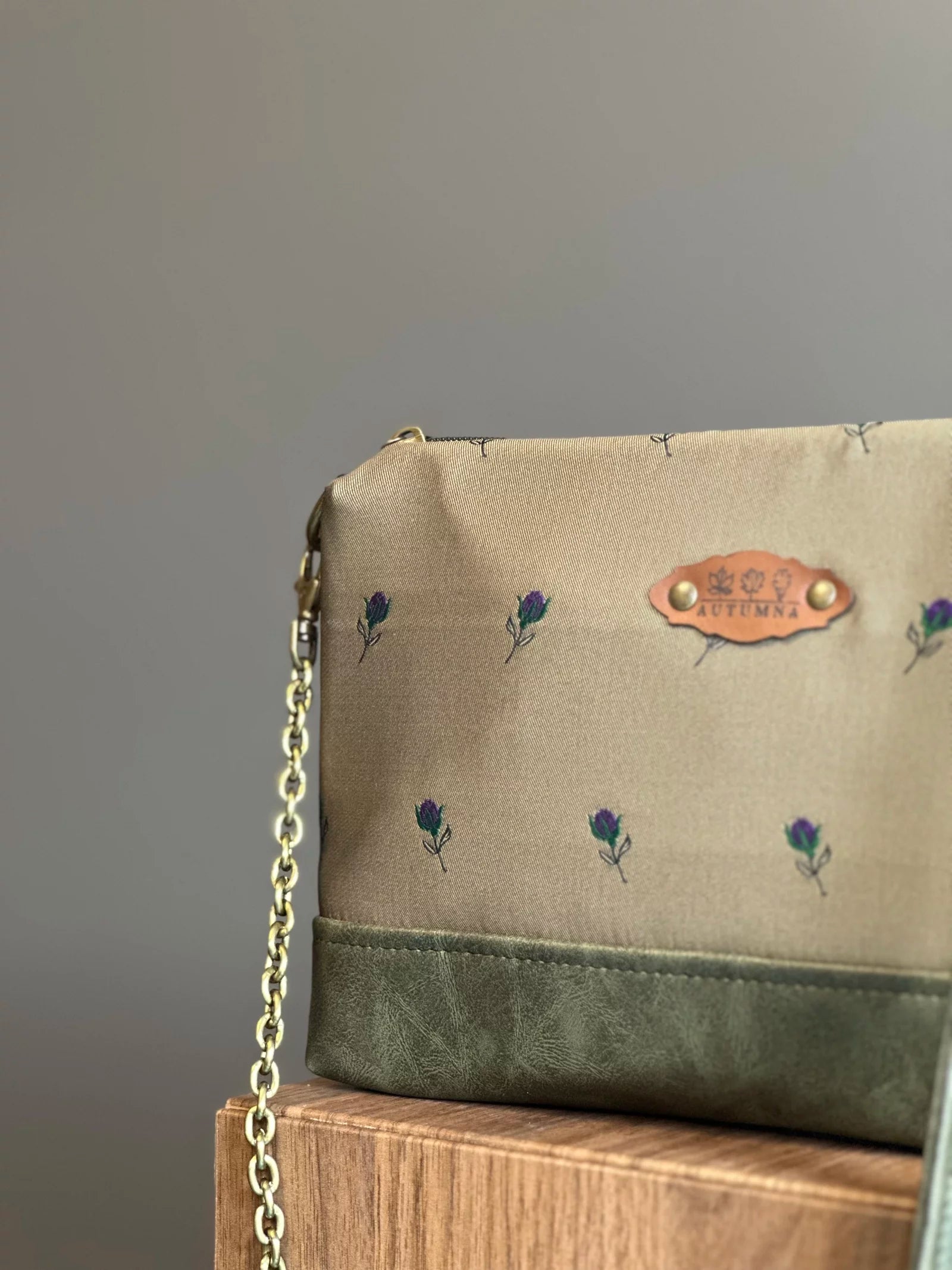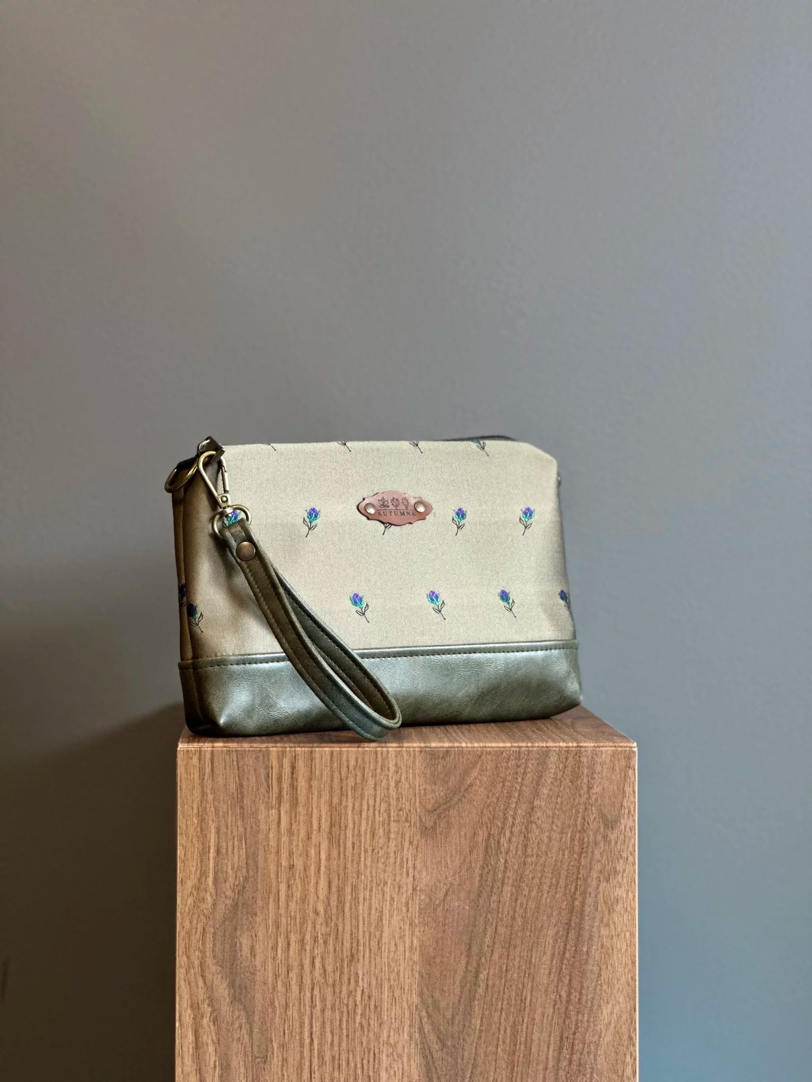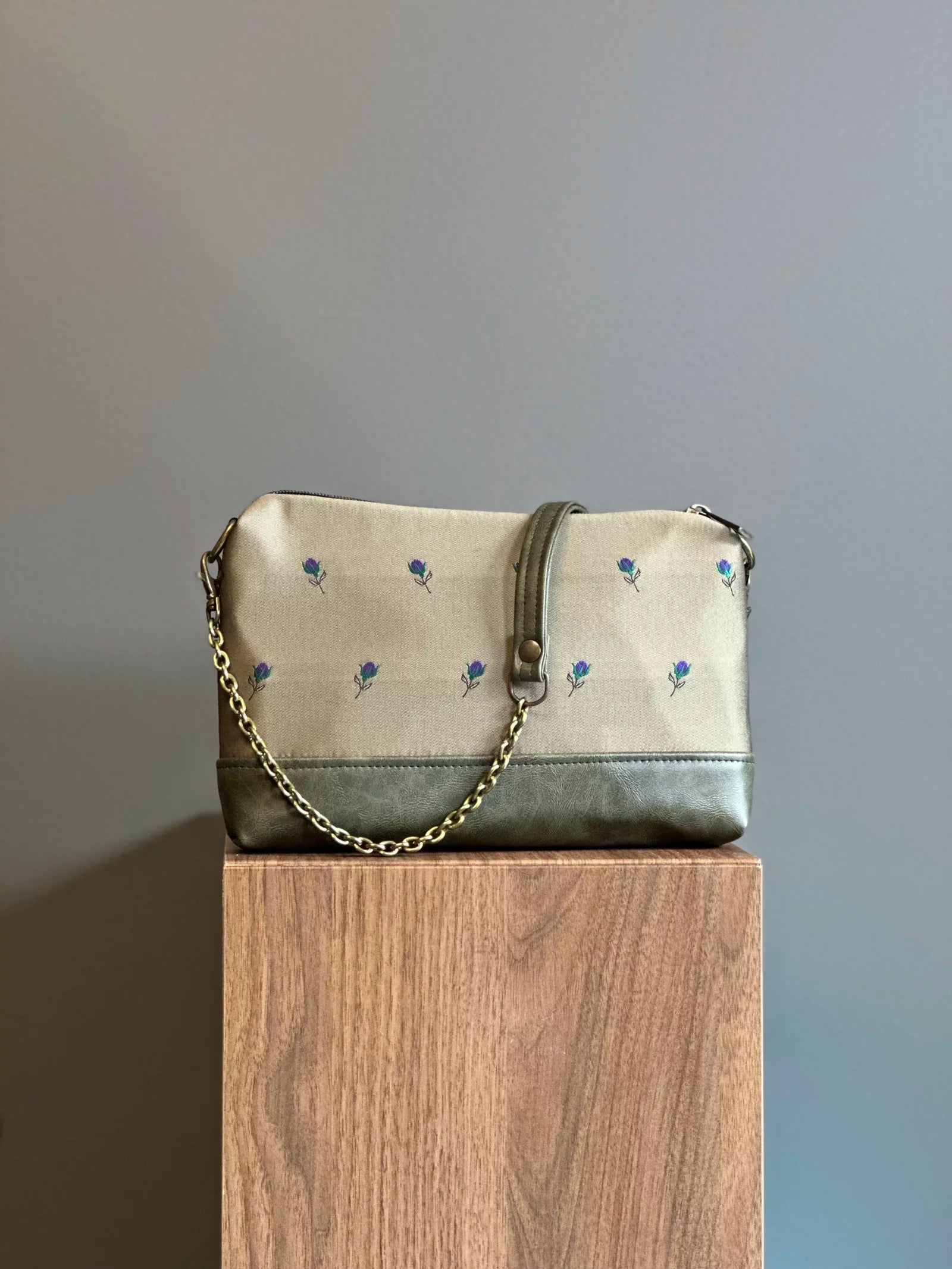 Realizzata a mano in tessuto d’arredamento e similpelle.