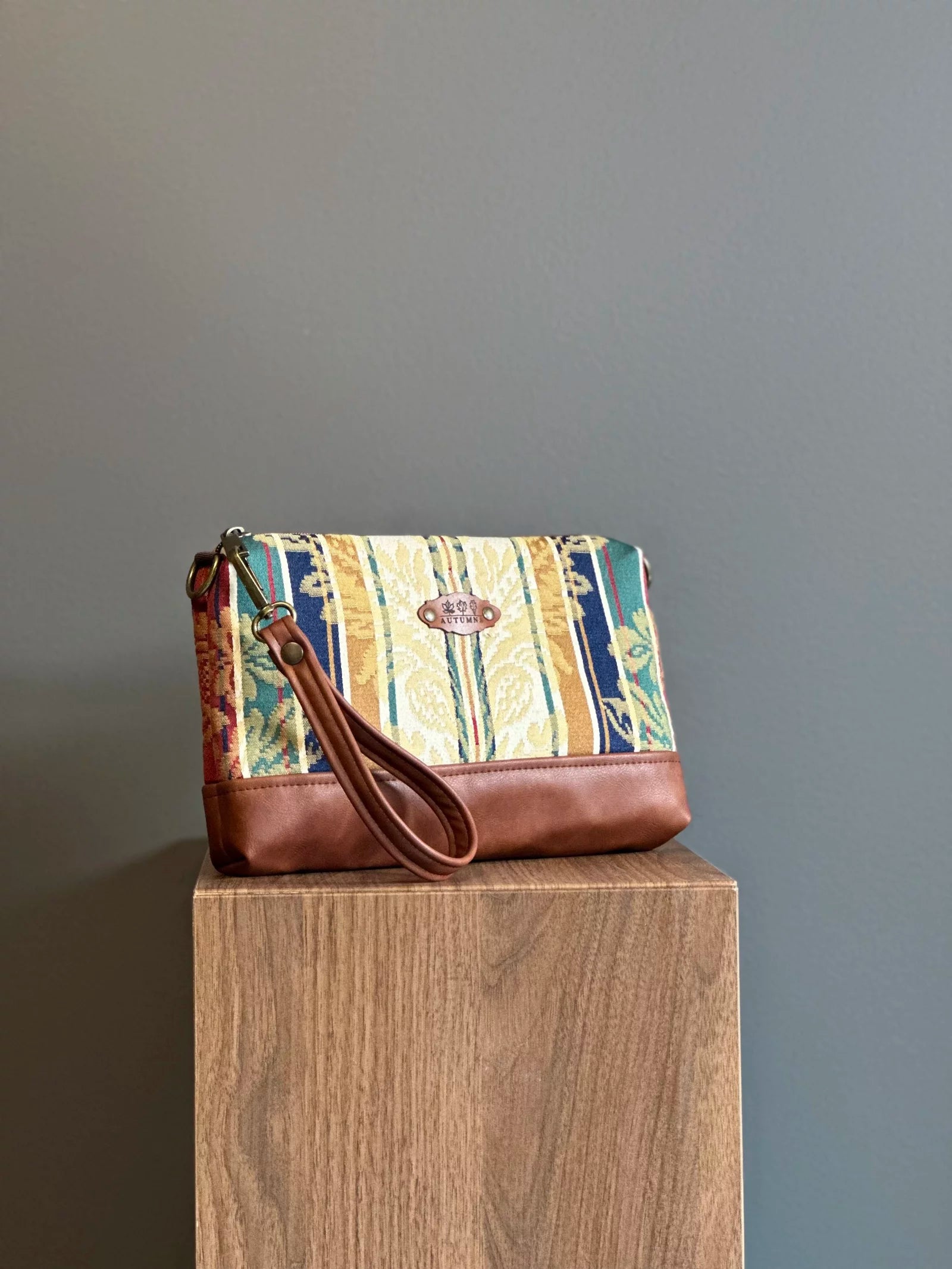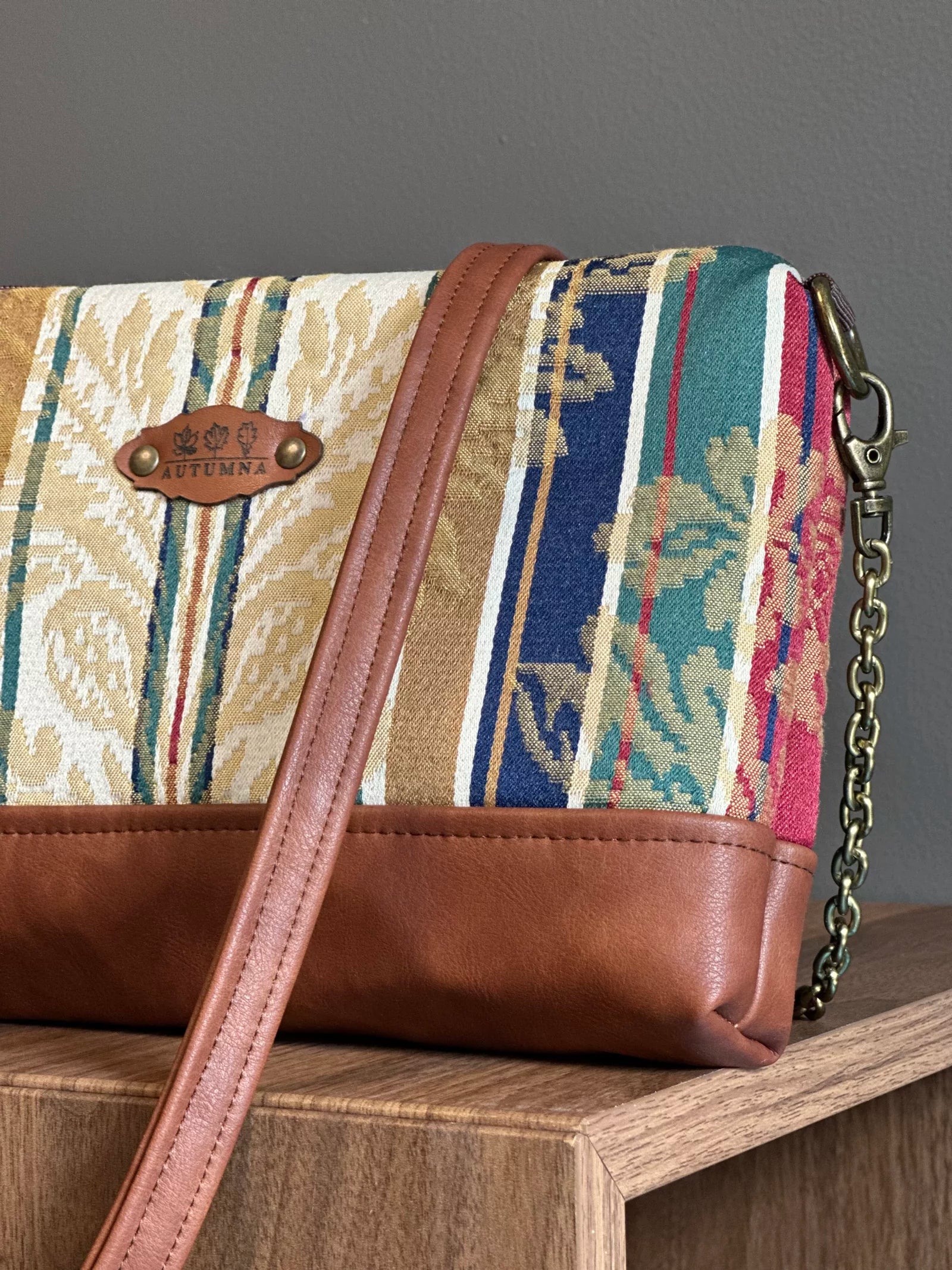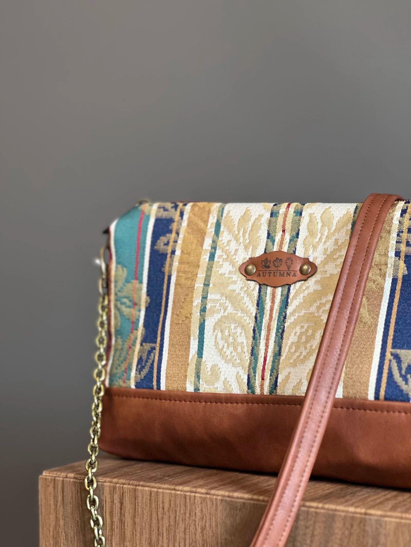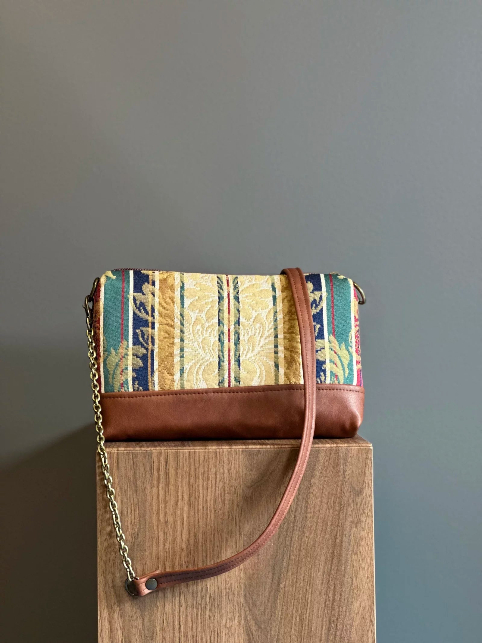 Realizzata a mano in tessuto d’arredamento e similpelle.