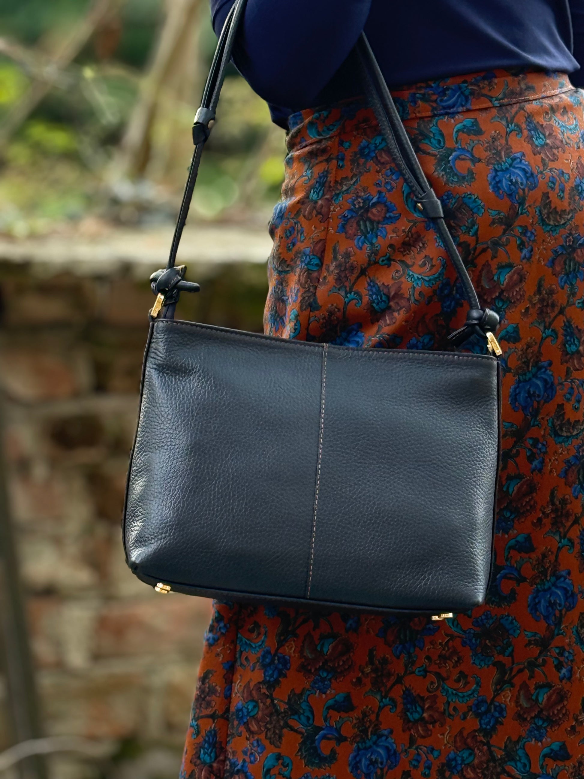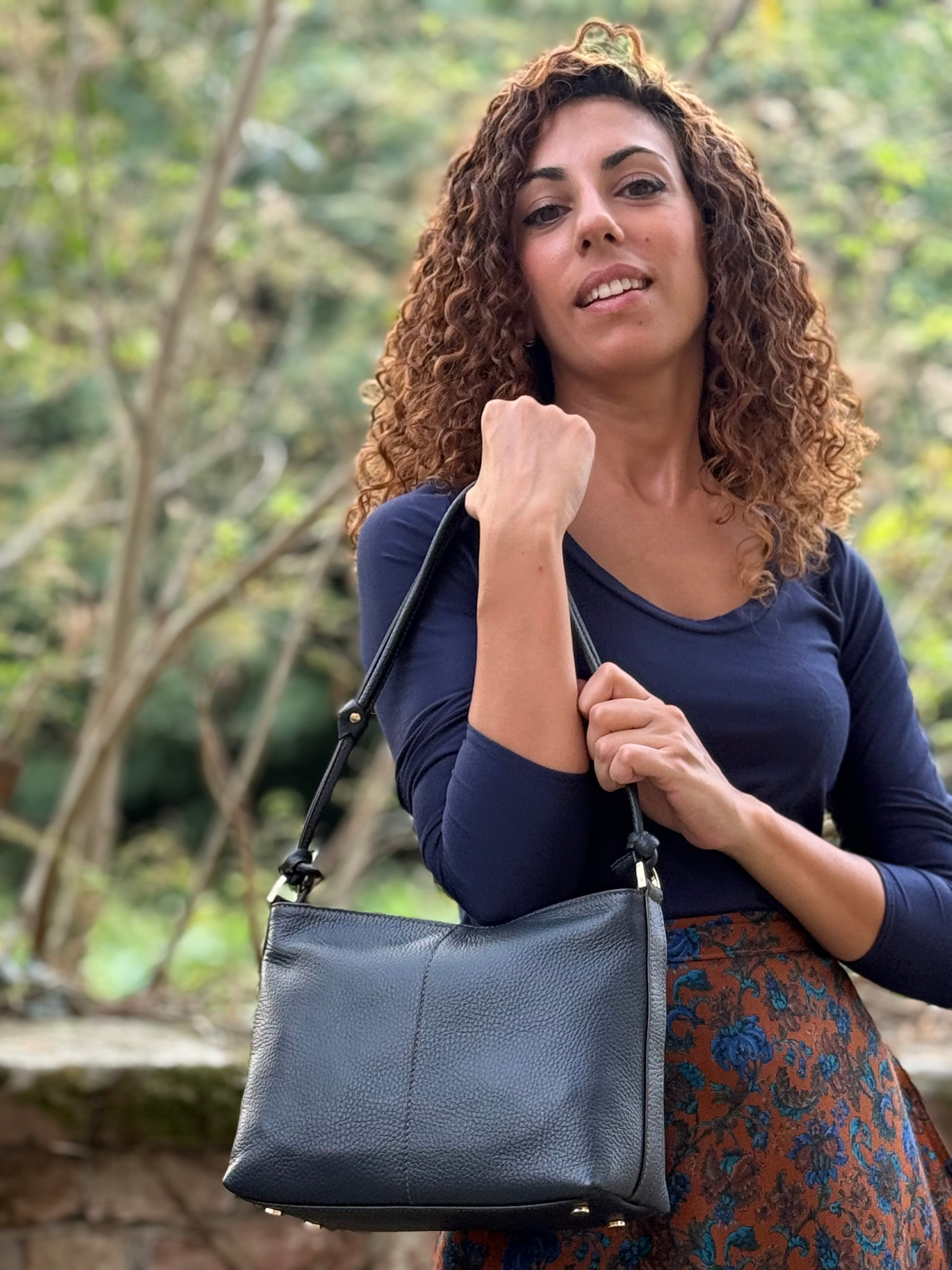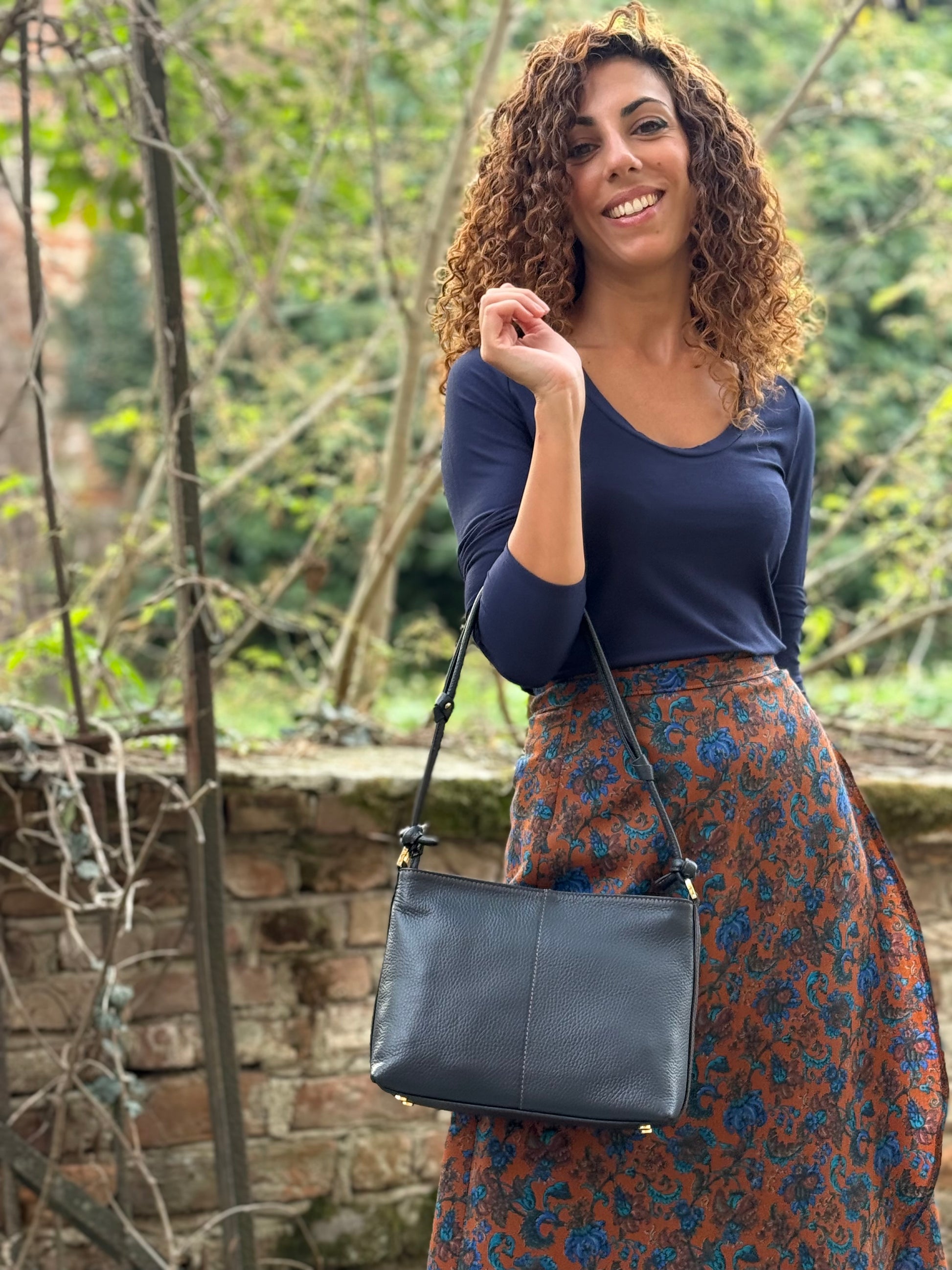 Compatta e capiente, da indossare a tracolla per essere super comode, e con un semplice giochino di scorrimento potrai regolarne la lunghezza.
