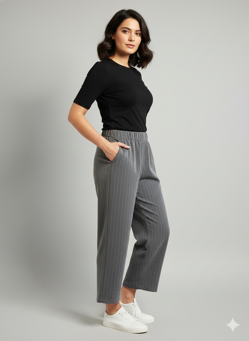 Il pantalone immancabile nel guardaroba. Vita elasticizzata, fianchi delineati e una gamba ampia ma non troppo, per esprimere un look dinamico, comodo e sempre elegante.