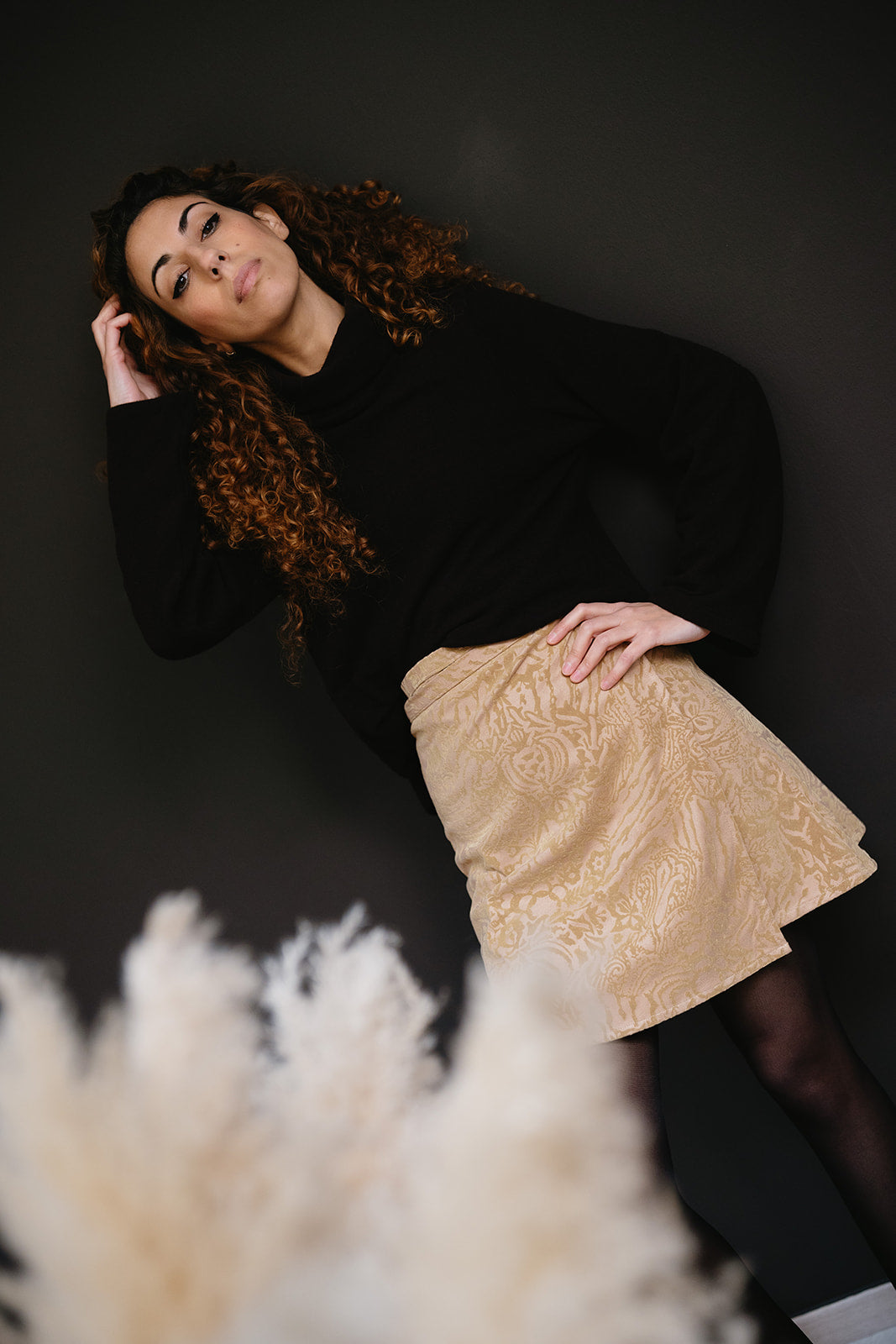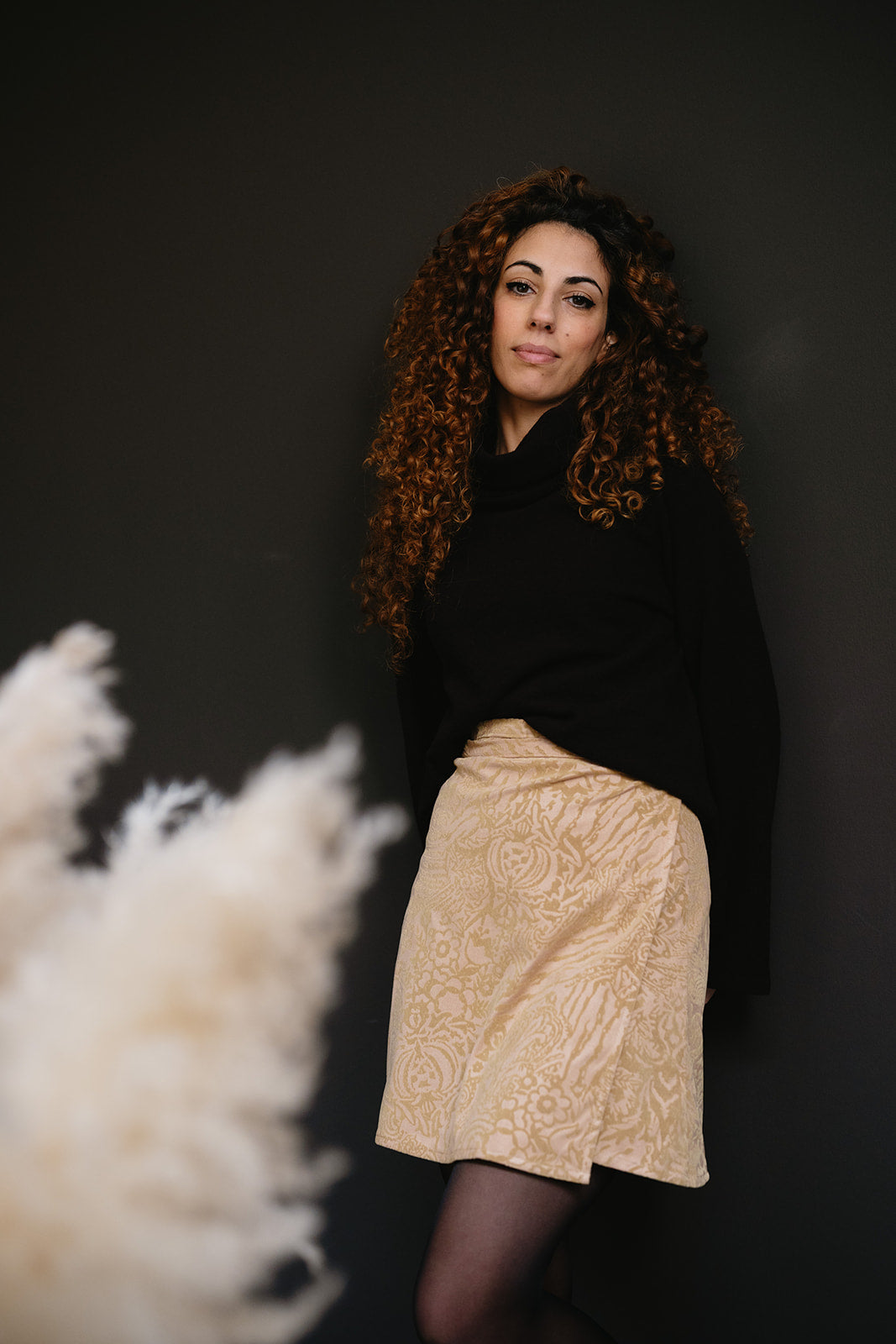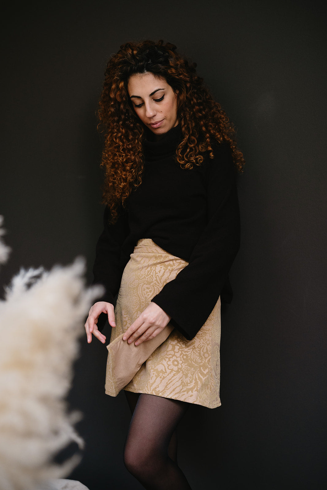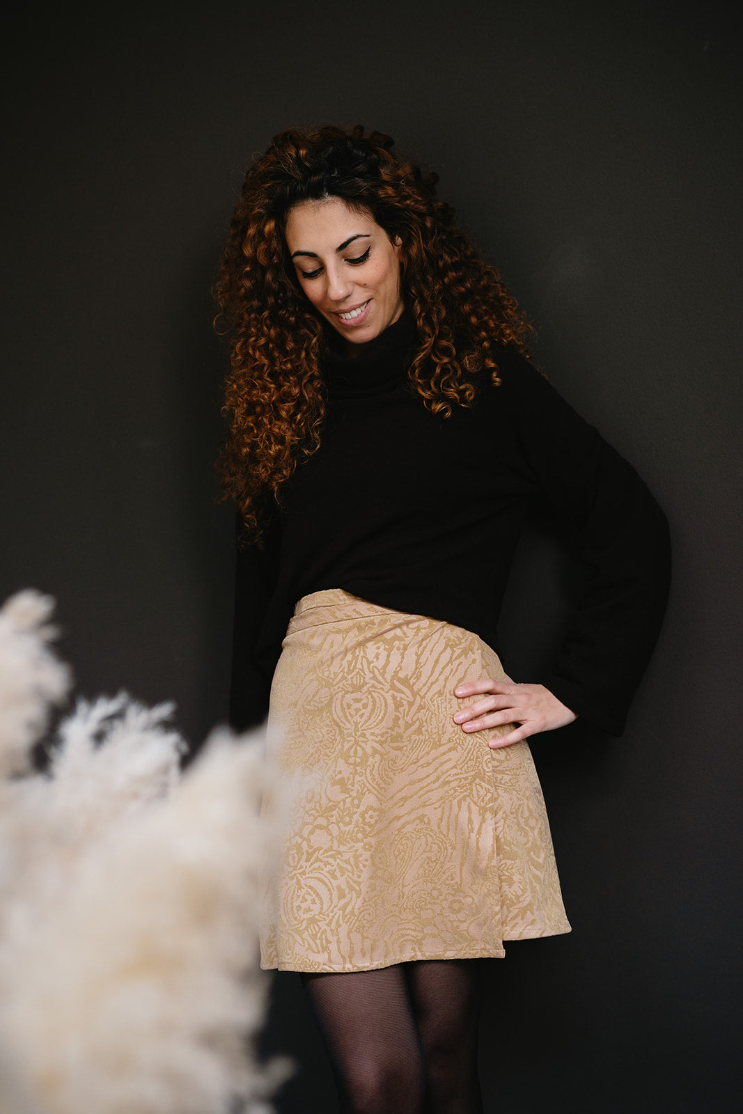 Una gonna a portafoglio dal taglio svasato, senza bottoni né asole, libera da rigidità: si chiude con un semplice nodo, come un abbraccio che si adatta a chi la indossa.