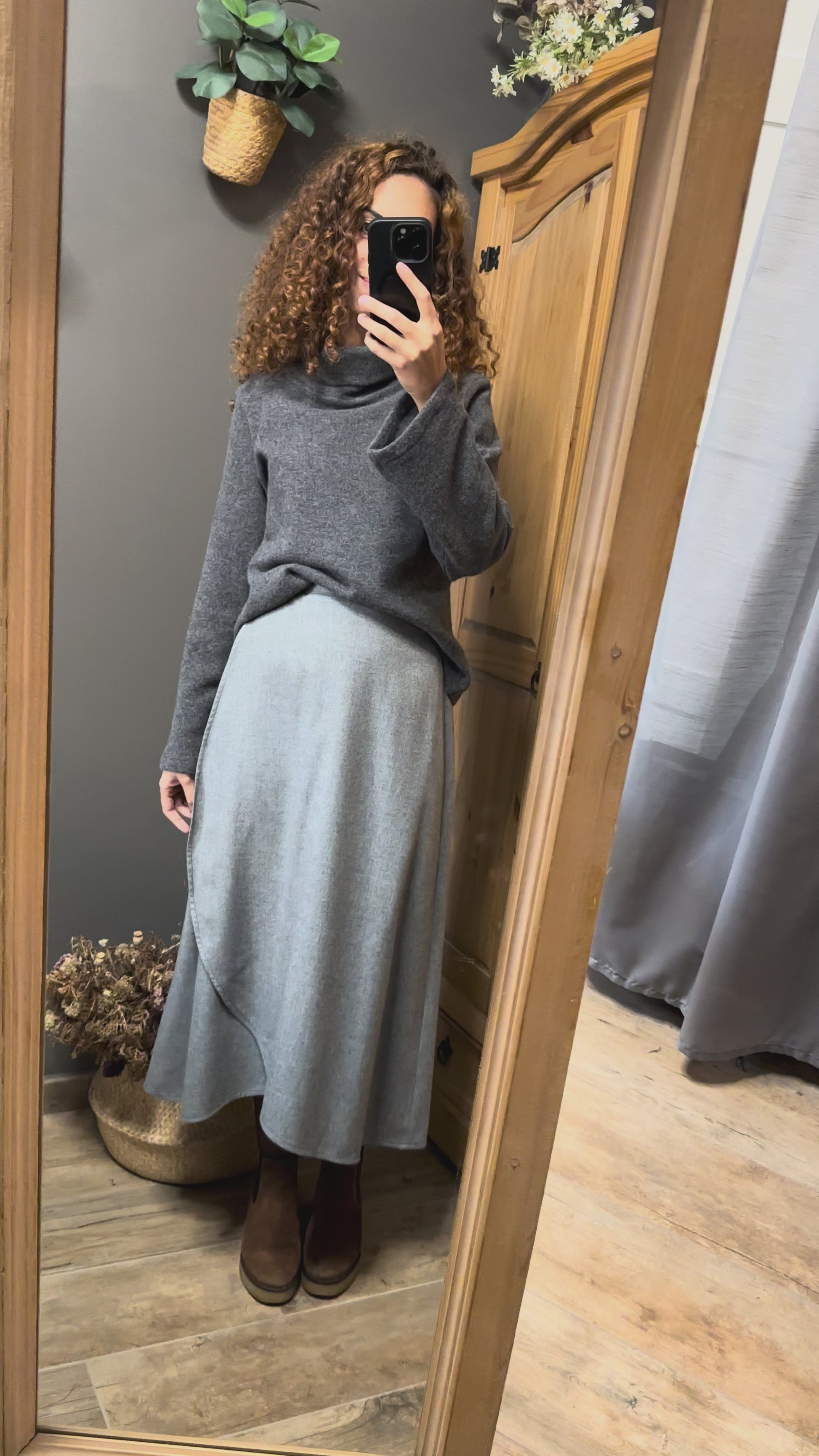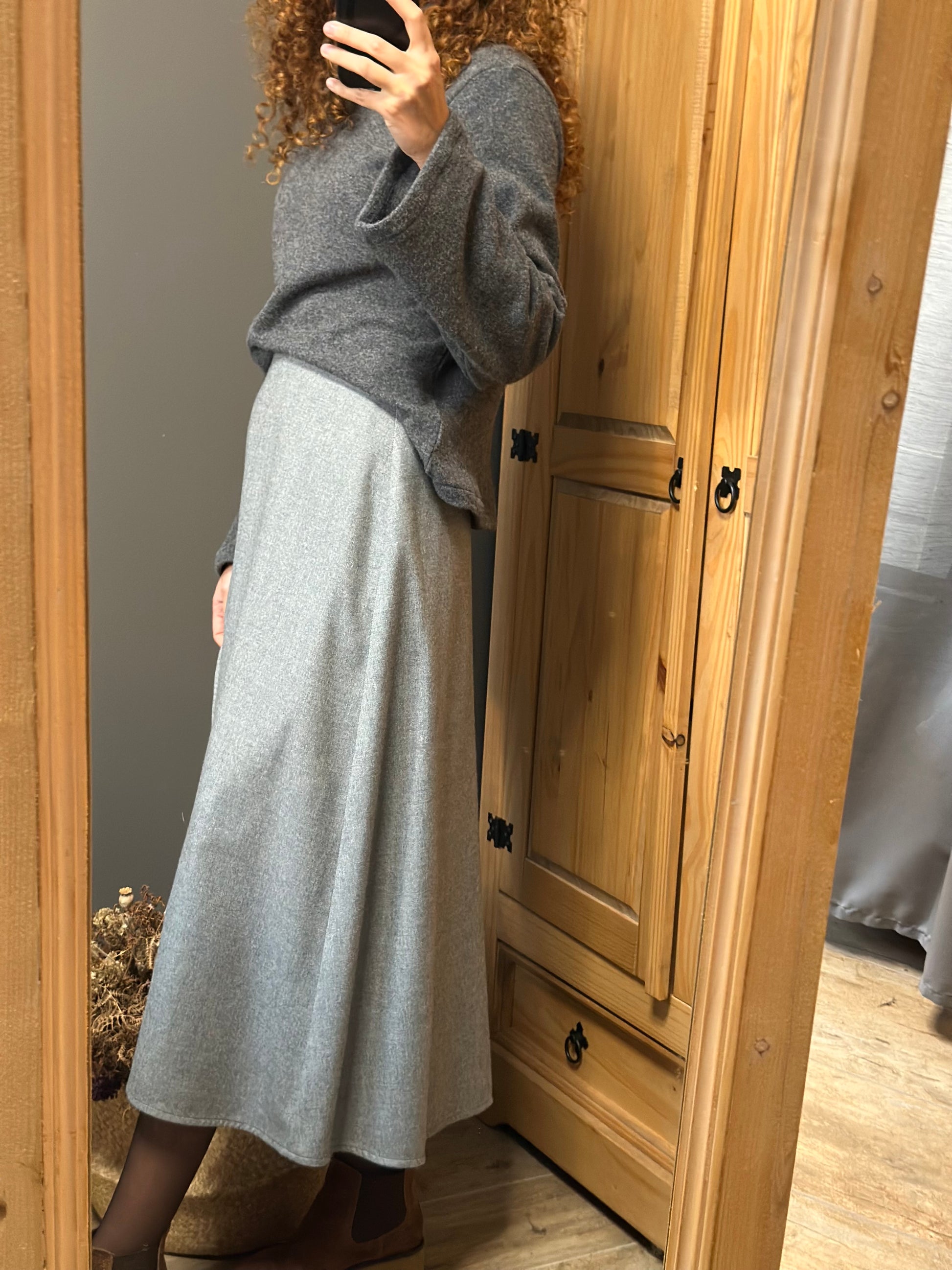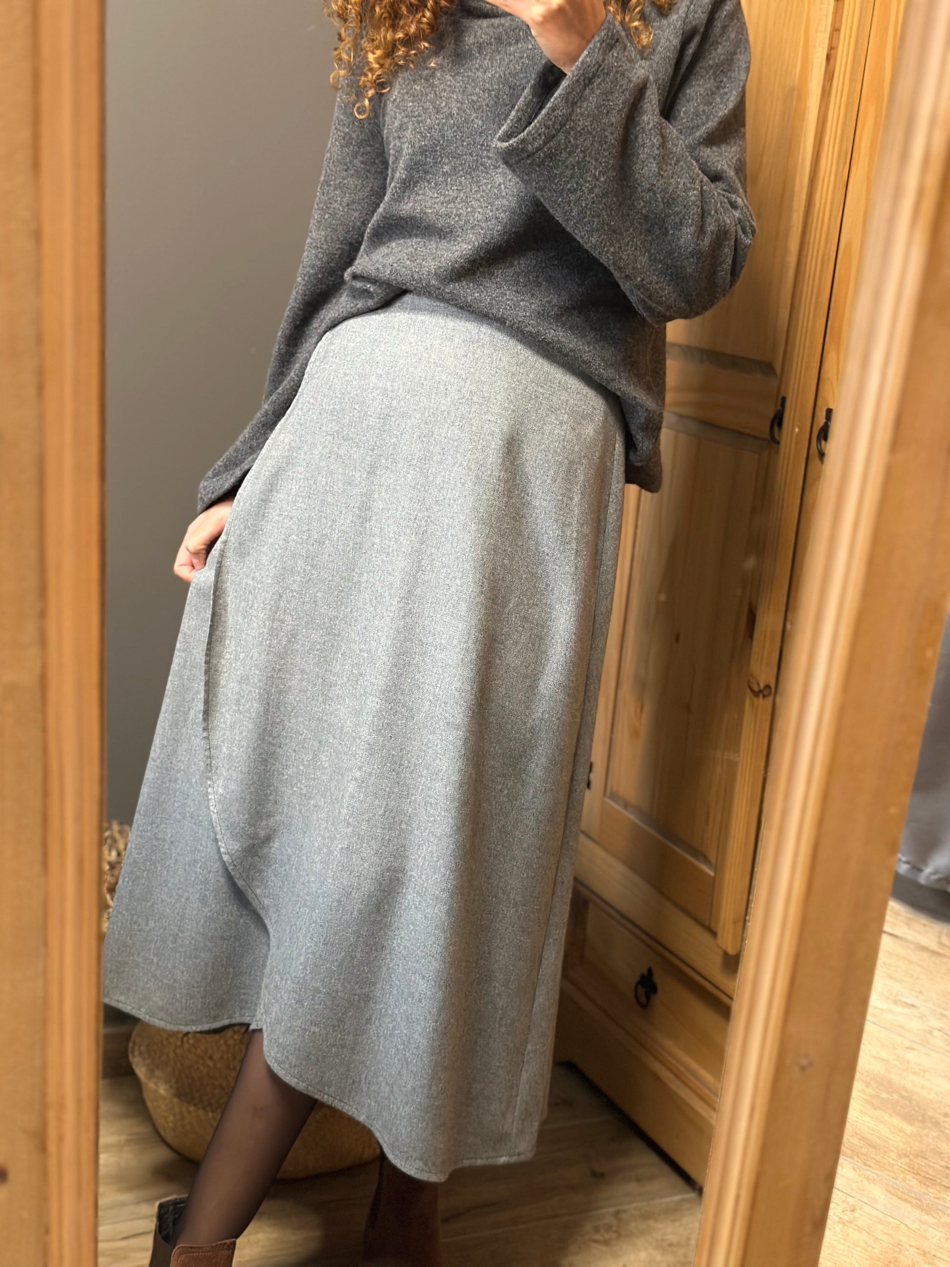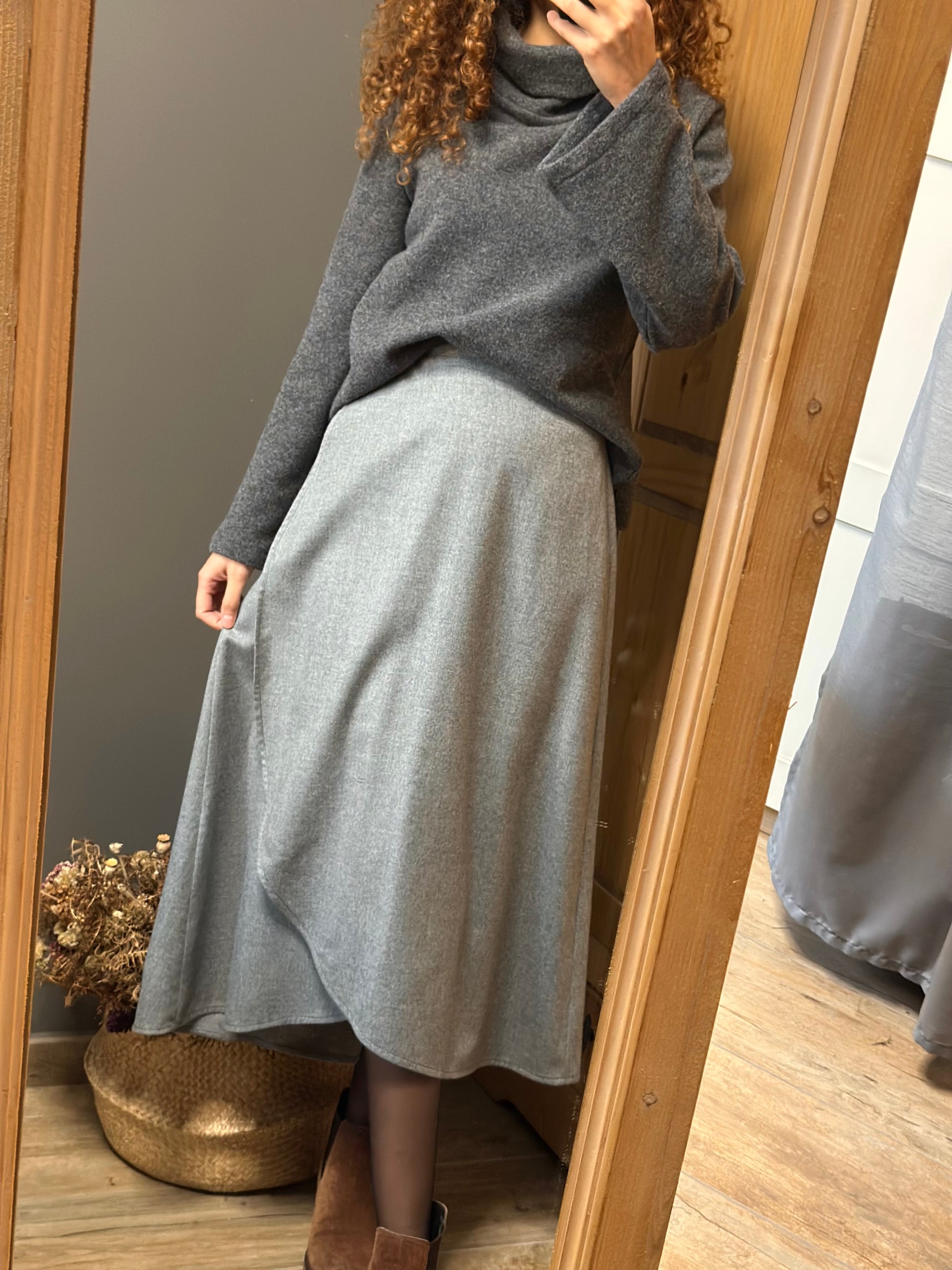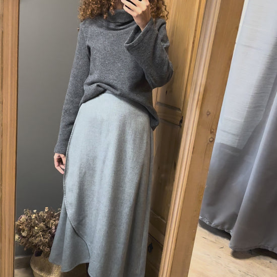 Una gonna a portafoglio senza bottoni né asole, libera da rigidità: si chiude con un semplice nodo, come un abbraccio che si adatta a chi la indossa.