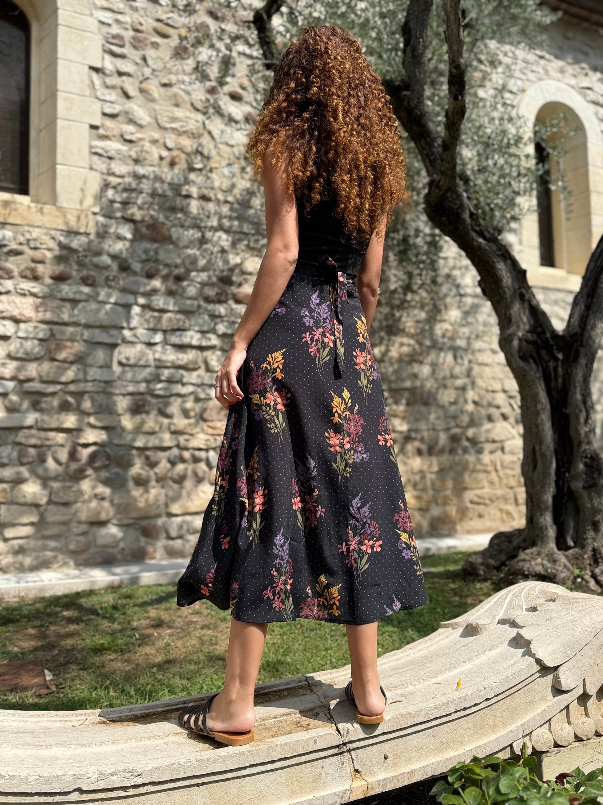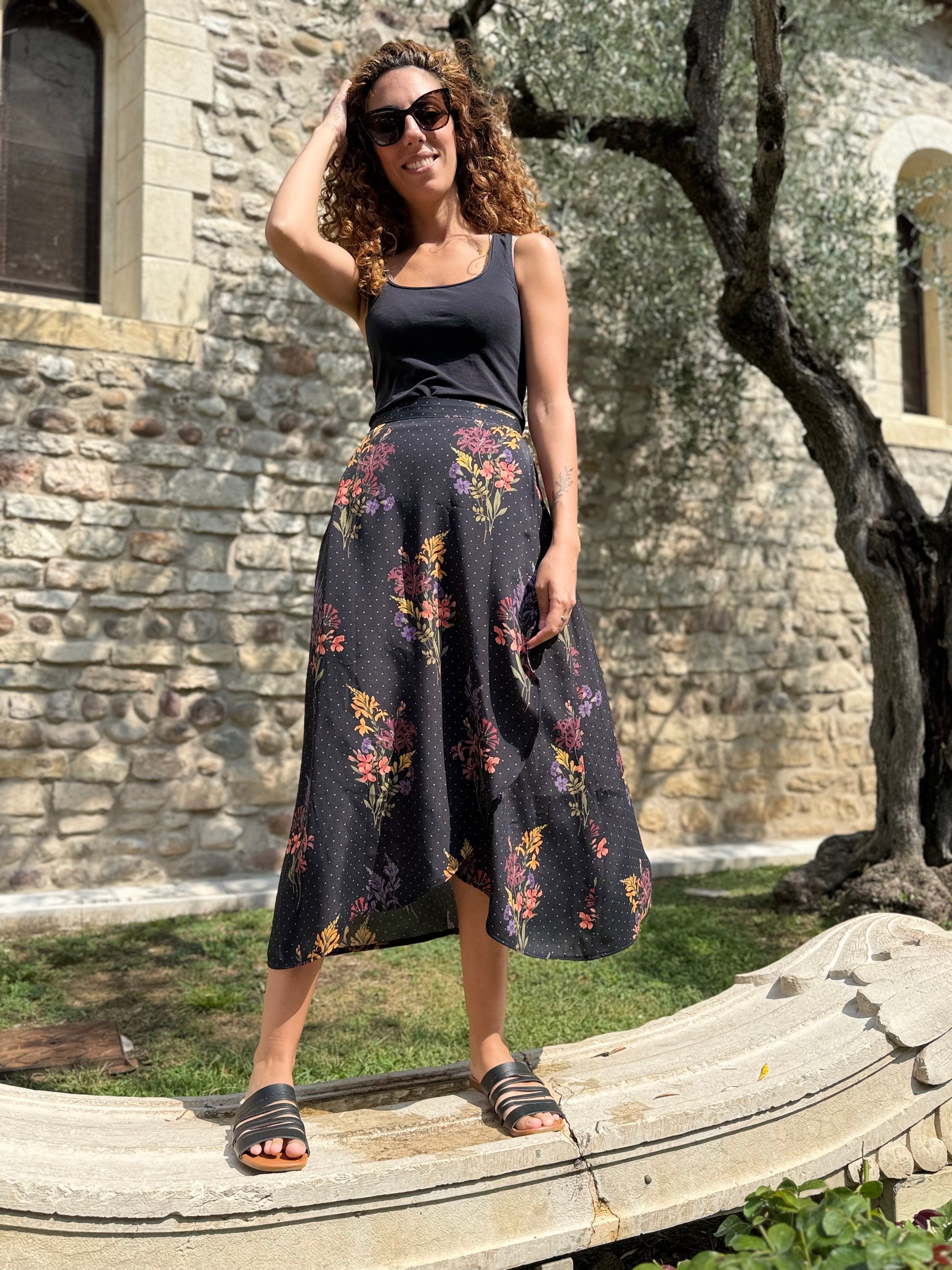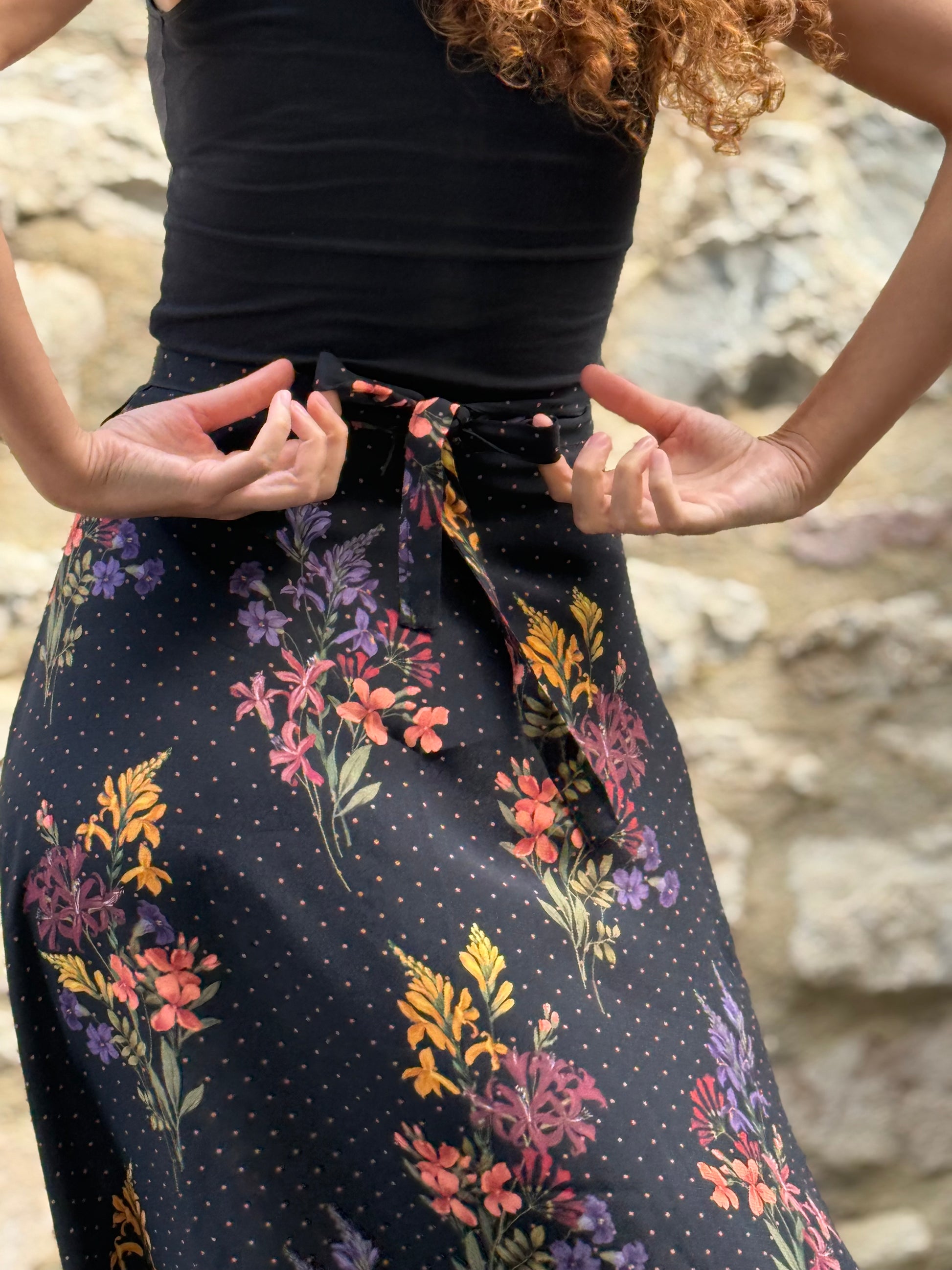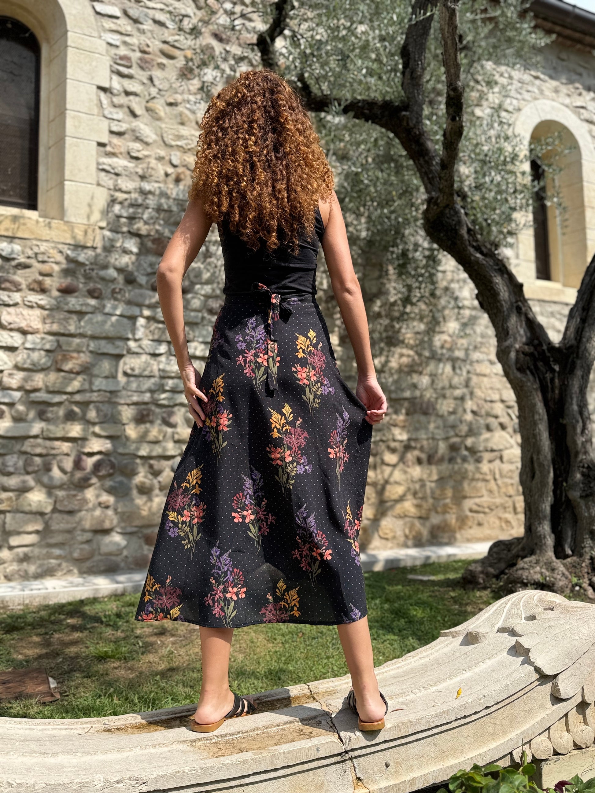 Una gonna a portafoglio senza bottoni né asole, libera da rigidità: si chiude con un semplice nodo, come un abbraccio che si adatta a chi la indossa.