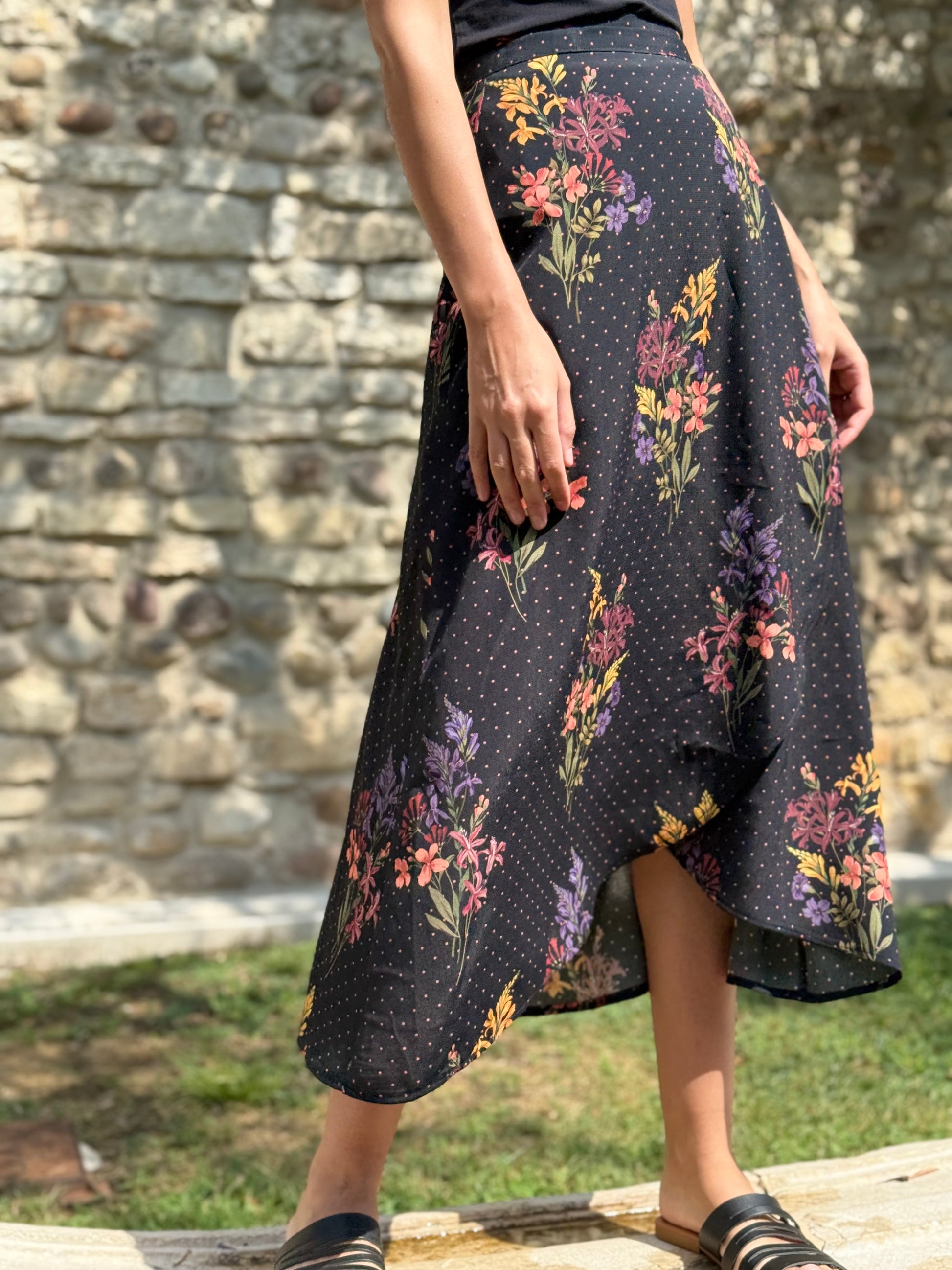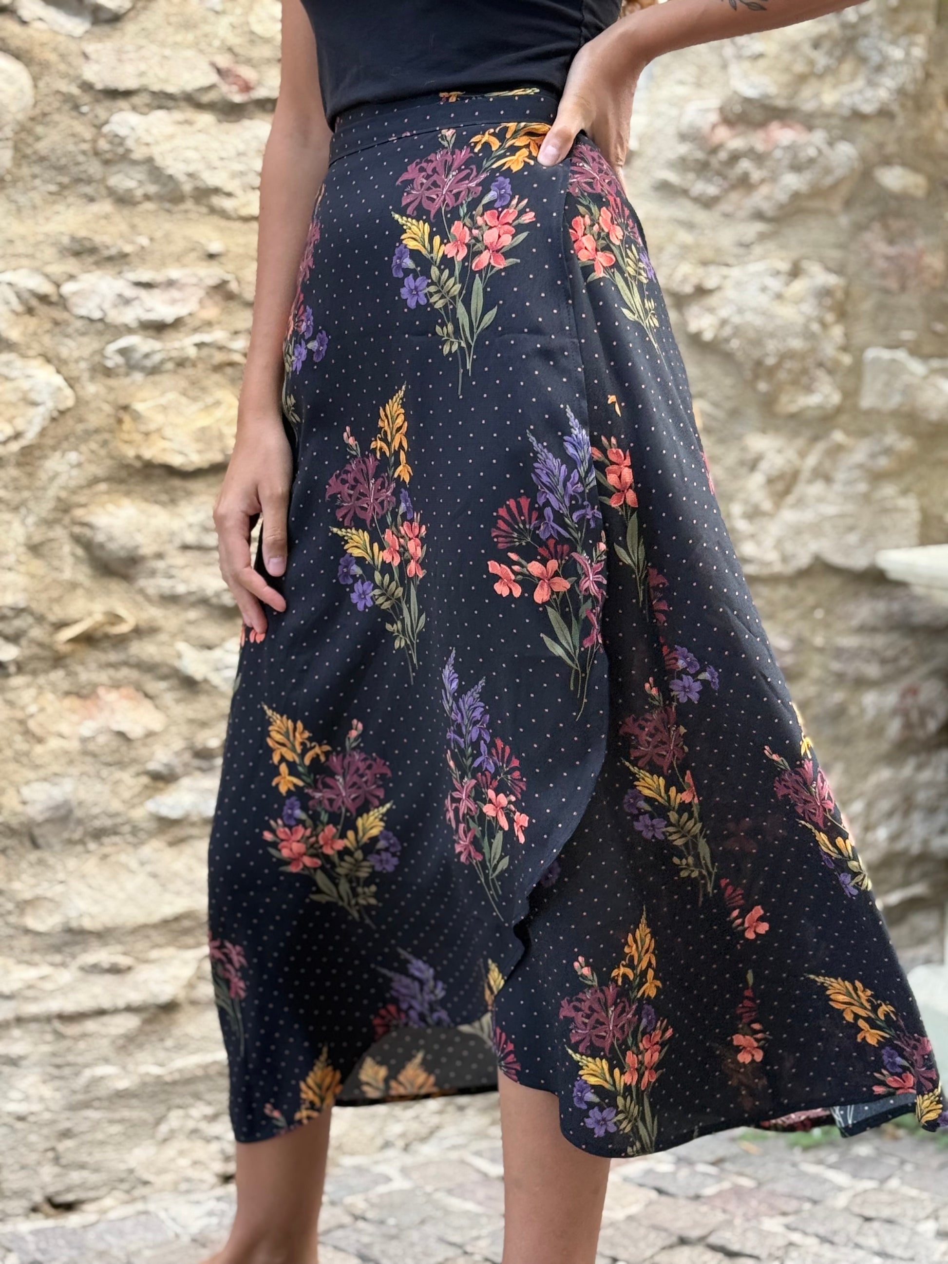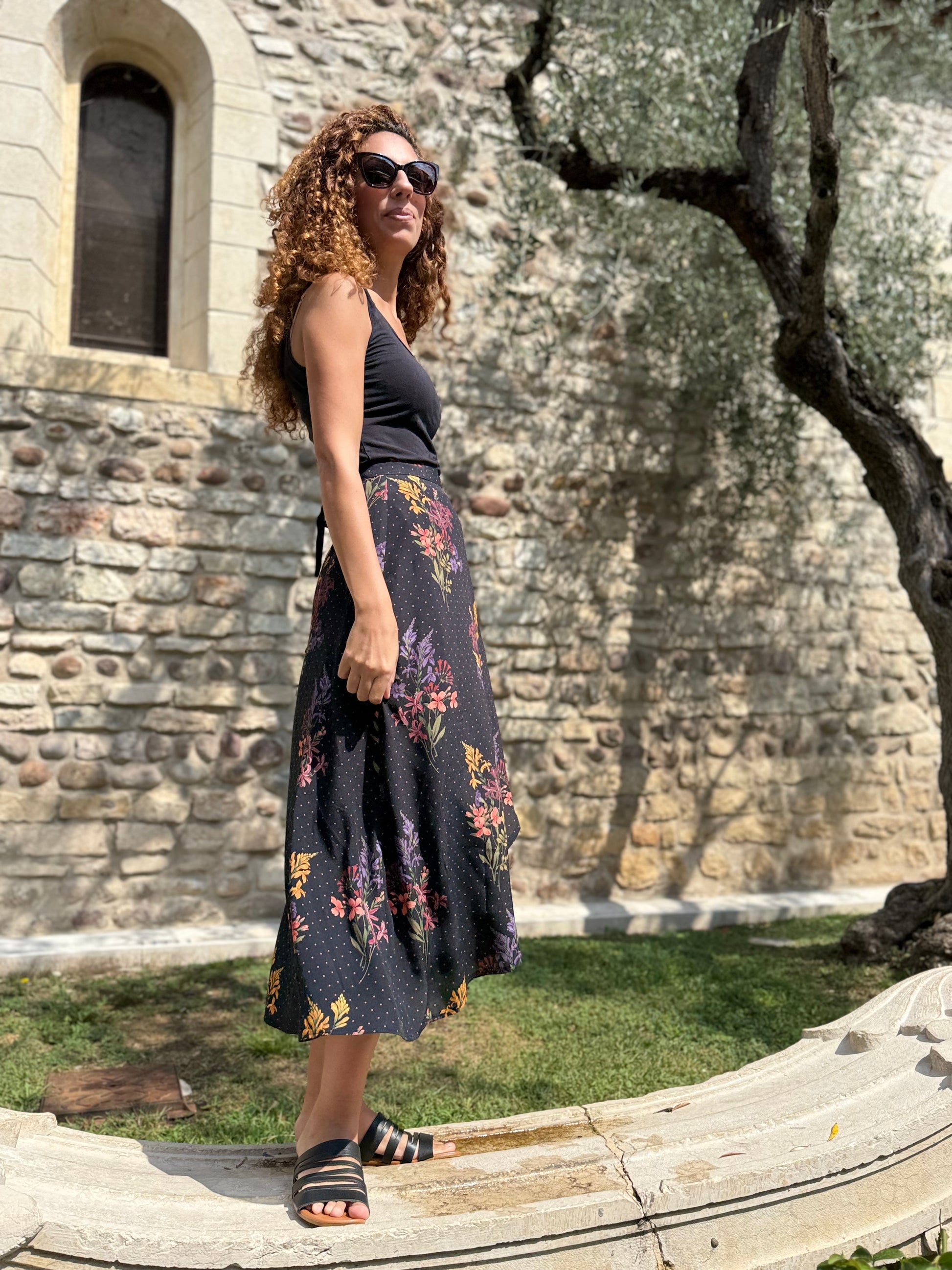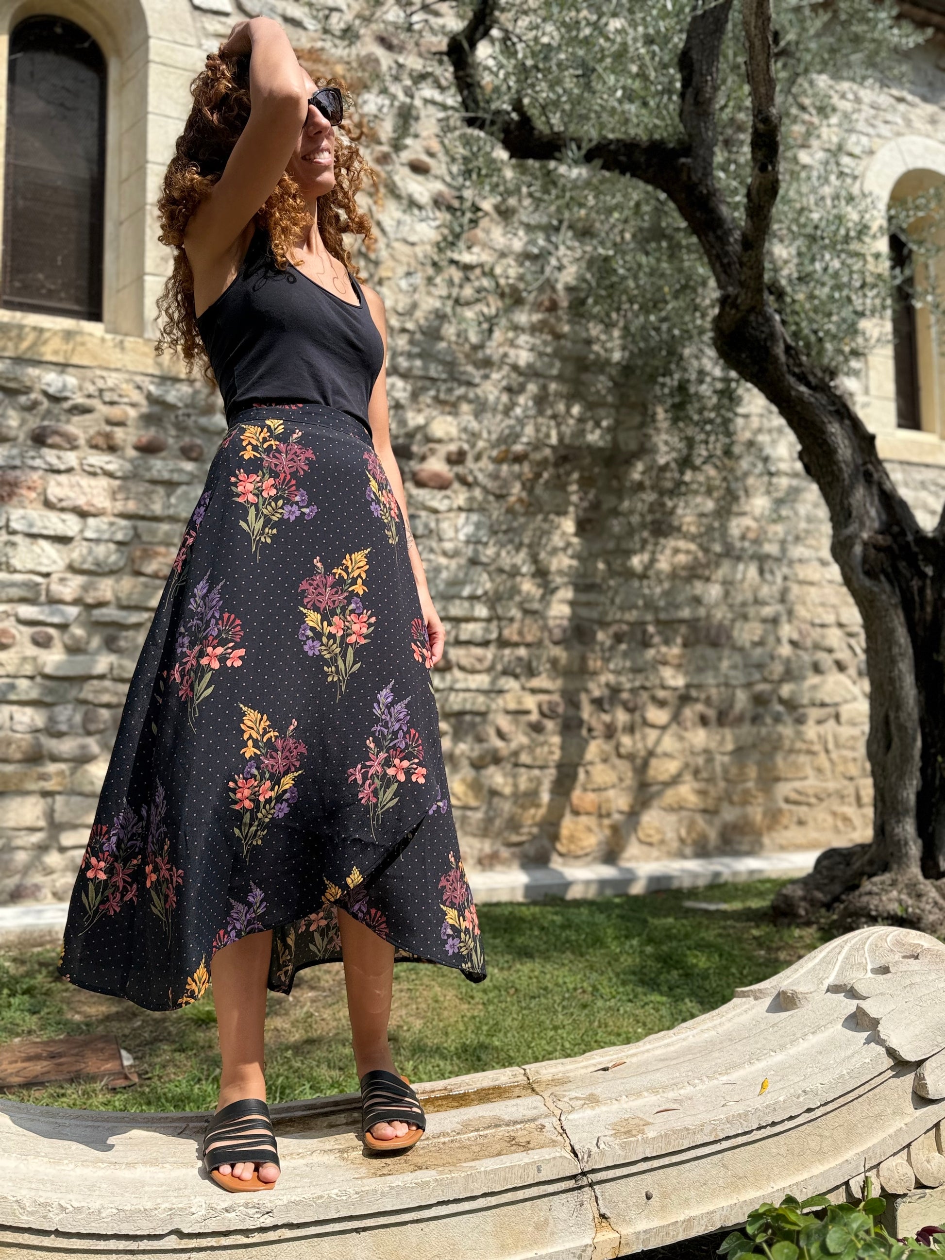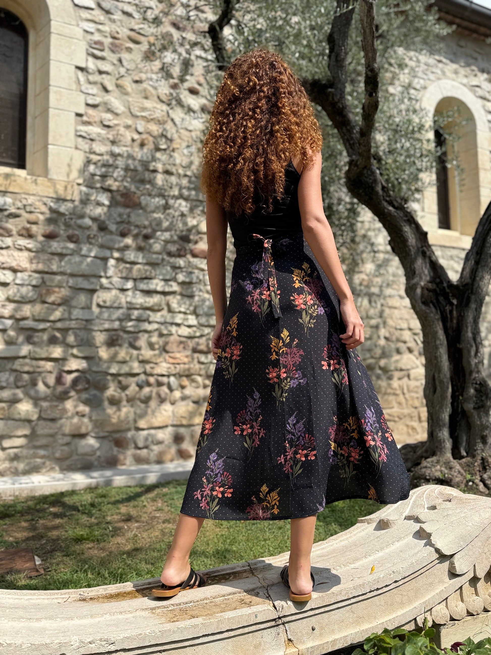 Una gonna a portafoglio senza bottoni né asole, libera da rigidità: si chiude con un semplice nodo, come un abbraccio che si adatta a chi la indossa.